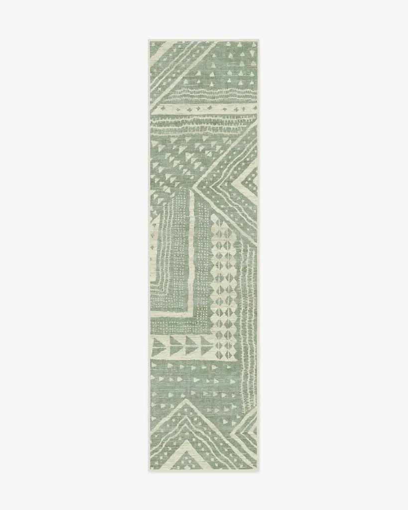 Bring home design that tells a story with our Malene Barnett Bogolan Sage Rug. Inspired by the handmade Bogolan fabrics from Mali, this design features modern geometric patterns and linework that pay homage to Bamana mudcloth techniques. Against a sage background, the light cream motifs add depth and dimension, creating an ombre effect that lends a hand-dyed look to the canvas. Water-resistant, stain-resistant, and machine-washable. Rug colors may vary slightly according to your device and the lighting in your space.