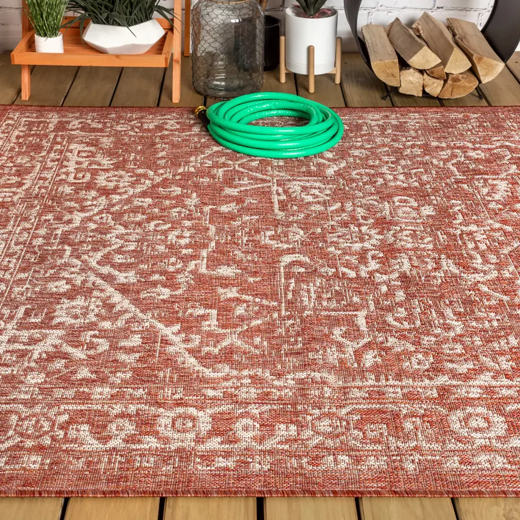 This colorful medallion rug adds rich Bohemian style to an outdoor porch or patio. Varied tones of taupe mingled with a rusty-red pattern give this rug a hand-woven, vintage vibe. The flatweave design is great for high-traffic spaces indoors too. Features:• Flat-weave construction of 100% polypropylene• Red and taupe with a handwoven mingled texture• Water resistance with 0.19" pile• 100% Polypropylene• No backing, use of rug pad is recommended (sold separately)• Power Loomed in Turkey• Actual Dimension: 3ft. 11 in. x 6 ft.• Color: Red/Taupe• Thickness measures: 0.19 in.• Available in multiple sizes and/or colorsRug Care:• Durable and easy-care - just sweep or hose down with mild soap and water• Packing and shipping may cause temporary creases in rugs, which will flatten out after a week on the floor; to expedite the process, try back-rolling your rug before laying it down, and then allow ample time for the remaining creases to relax• Please Note: Due to differences in monitors, some rug colors may vary slightly. Lengths and widths may vary from the published dimensions. Patterns may vary slightly according to shape and size selected.About us:Style your floors with JONATHAN Y. By combining fine craftsmanship and design, this New York creative studio is bringing fashion to your floors. The collection mixes sustainable organic materials, vibrant colors and trend worthy styles to create JONATHAN Y''s distinctive catalog of rugs.