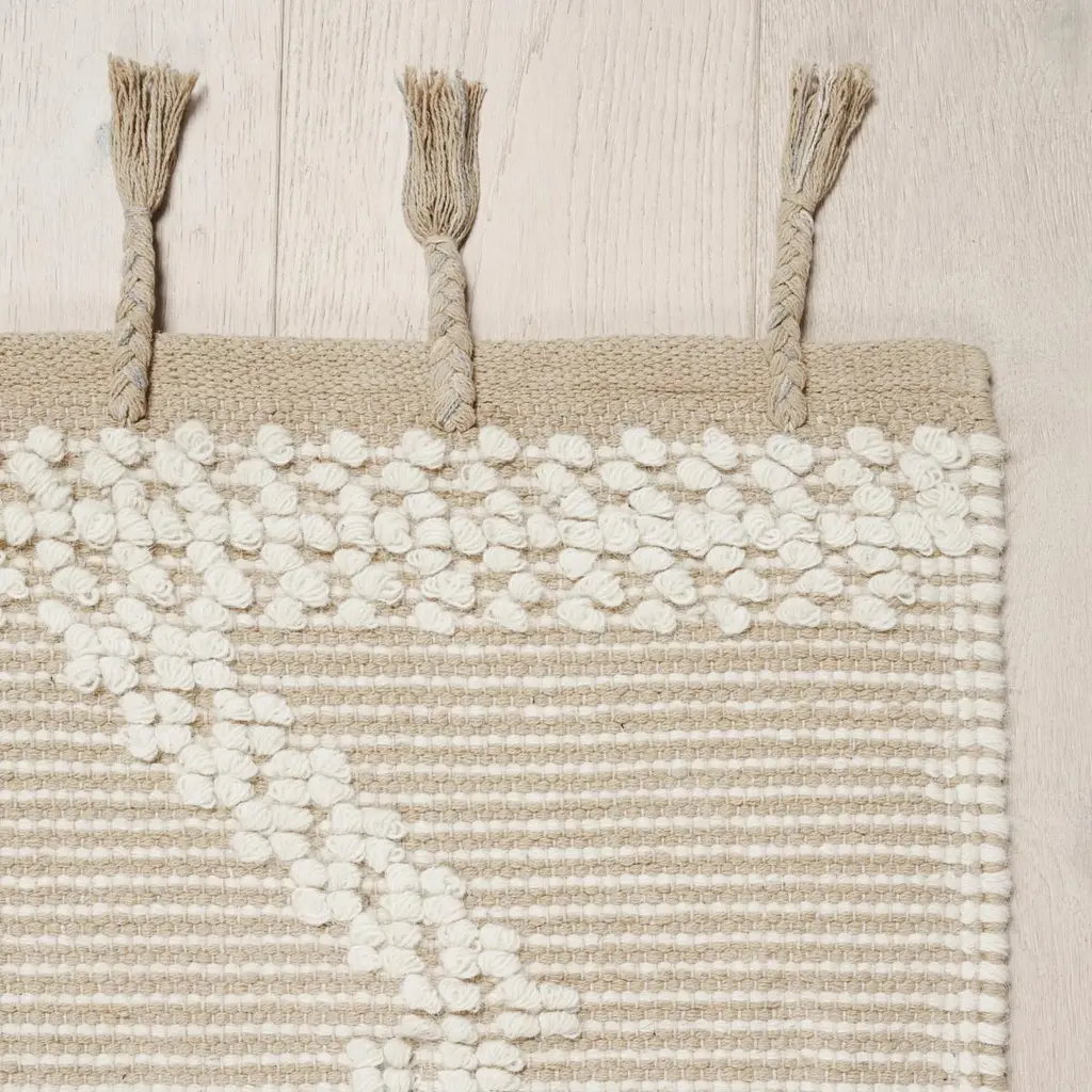 Made of wool and cotton on a traditional pit loom, Malta French Knot is a dynamic stripe with lovely dimension and texture accentuated by tassel fringe. This versatile geometric design has a casual look that works absolutely anywhere.