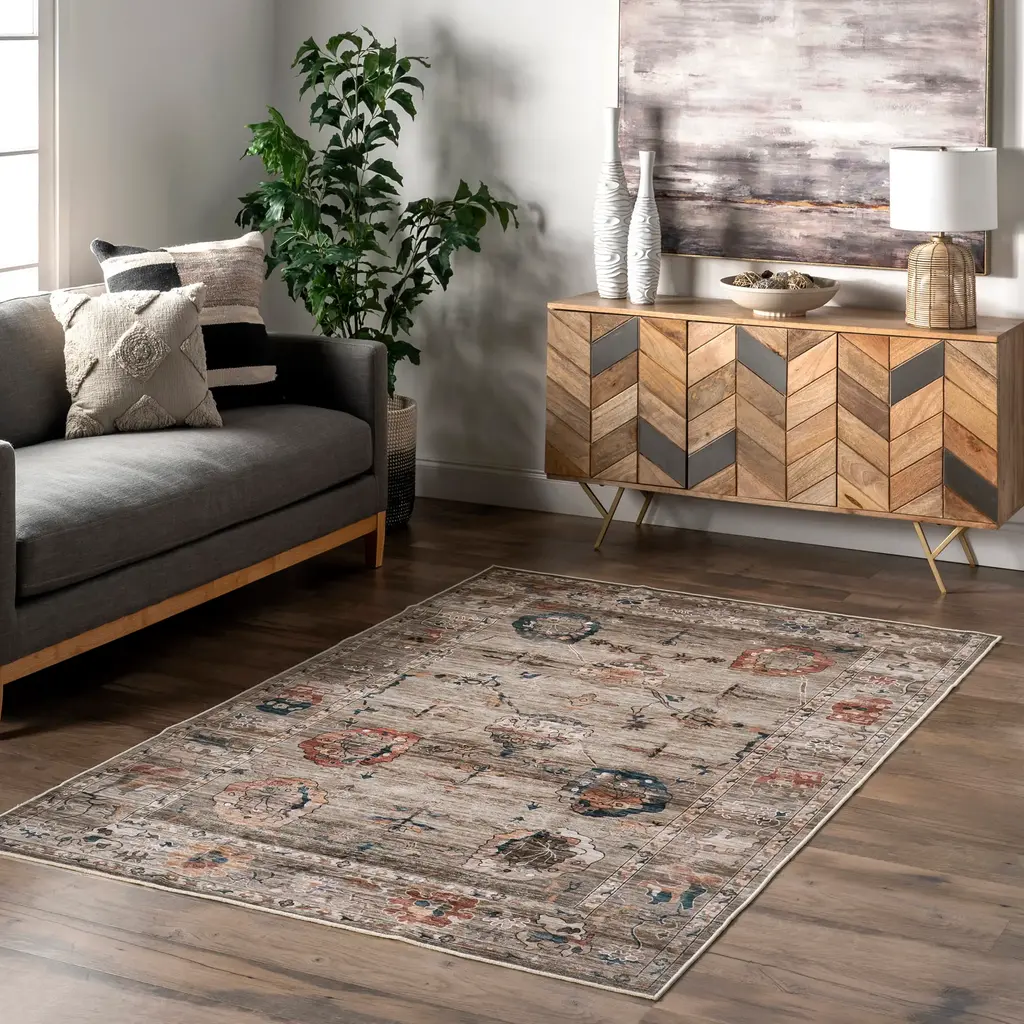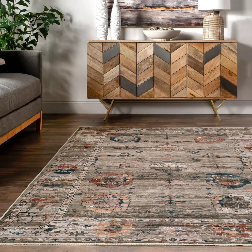 Mandi Vintage Floral Spill Proof Washable Rug | Taupe - 4' X 6'