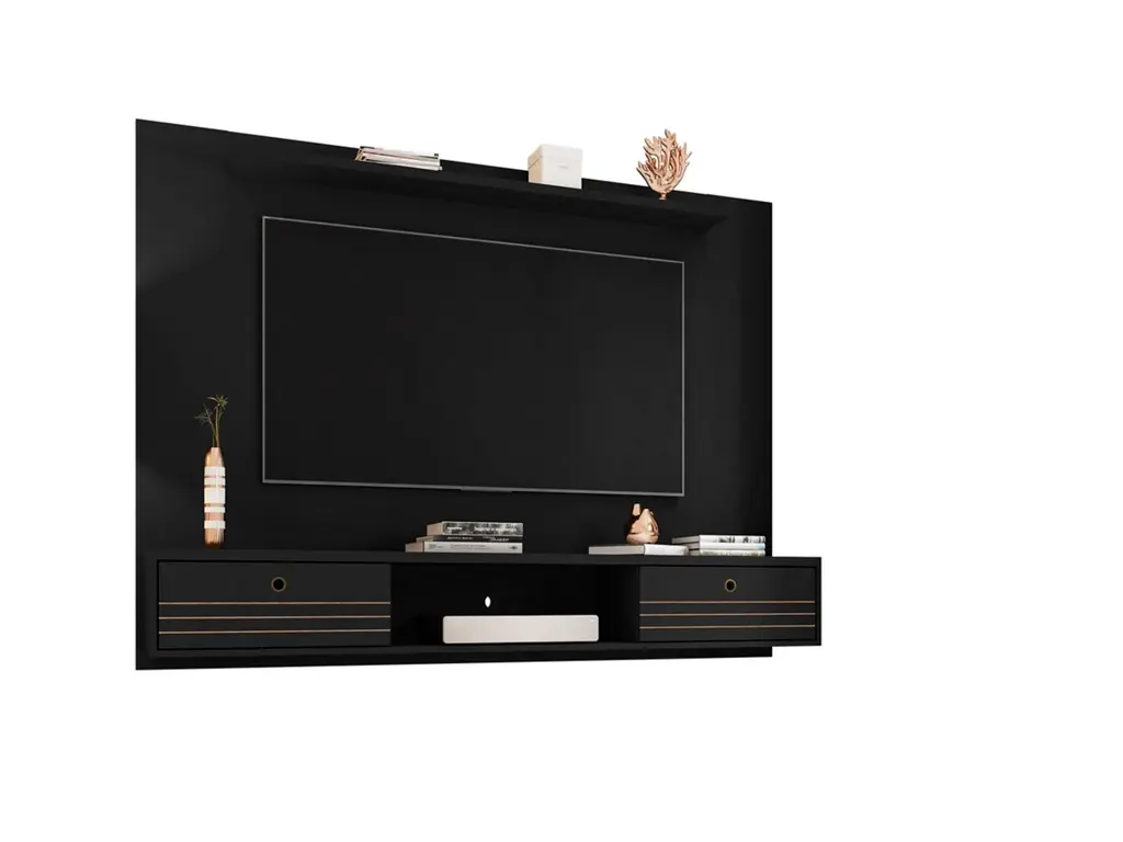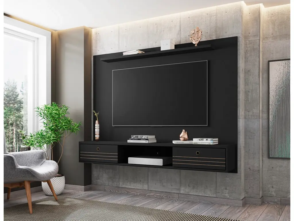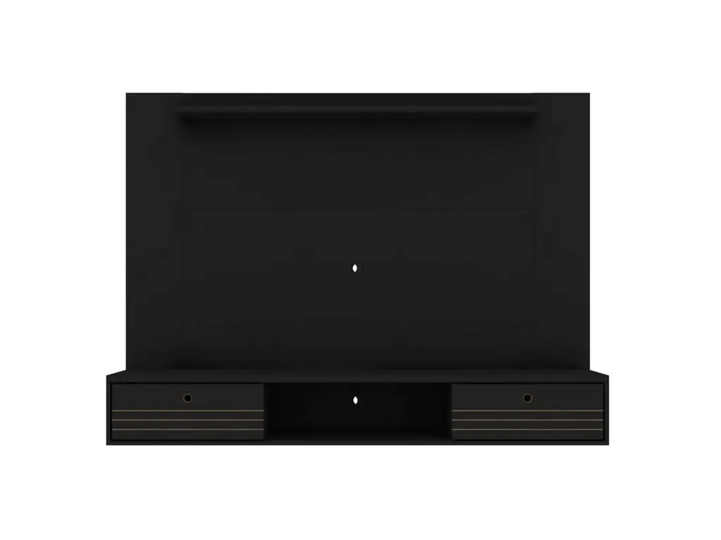Host the ultimate movie night at home with the Liberty floating entertainment center, which helps tuck away all your media accessories, gaming consoles and more. Concealed storage is perfect for tucking away albums, books, magazines or extra electronics. Upper bonus shelving displays family photos and keeps all your remotes on hand. Streamlined finishes, intricate lines and mid-century modern design touches add visual interest and easily blend with any existing decor. Add decorative accents up top or a bright rug underneath to help balance the area and make the space your own. Get the popcorn started and call your friends, because your at-home theater has never looked better.