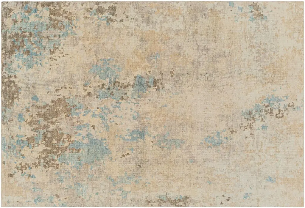 This painterly rug was hand-knotted of wool by Indian artisans. Its abstract design and soft, dreamy palette will bring a sense of serenity to any room. A rug pad is recommended to help prevent slipping and extend the life of the rug.