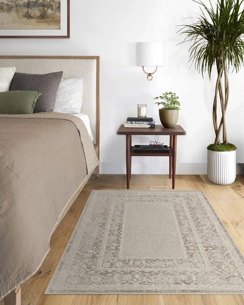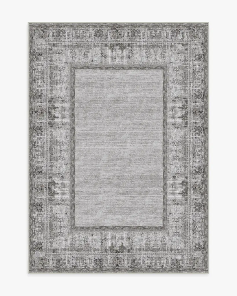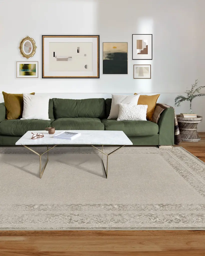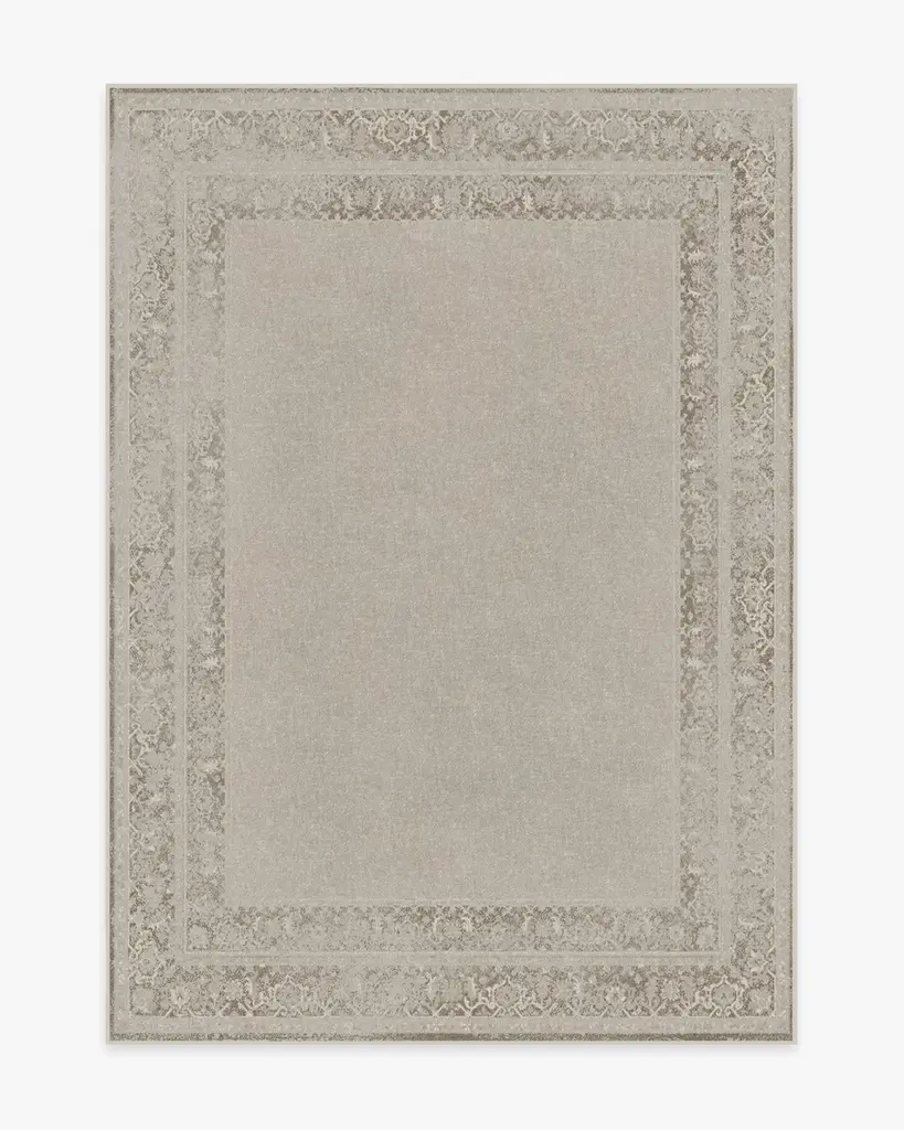 Style your space with our gorgeous Maral Border Hazel Rug. This elegant rug, which features a traditional Persian rug-inspired motif, is beautifully rendered in soft hues of silver taupe and natural linen.