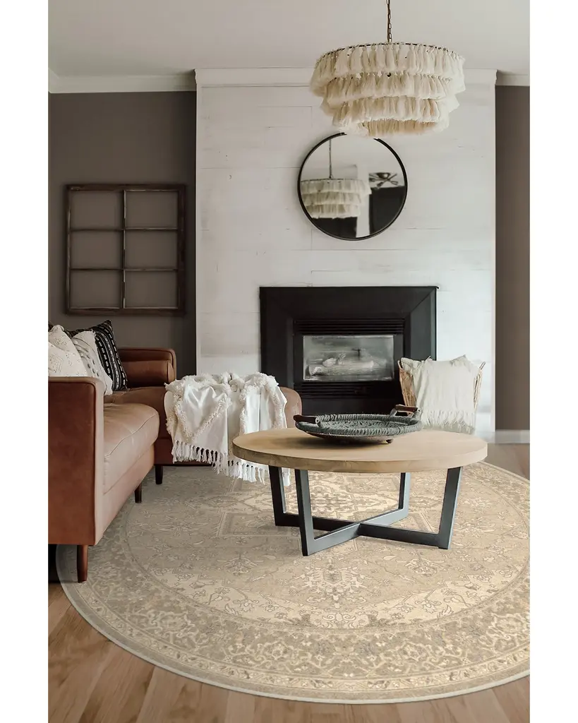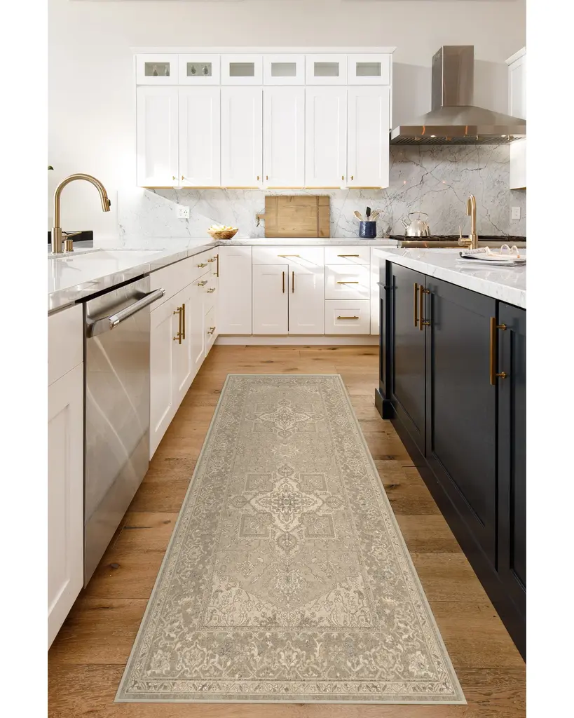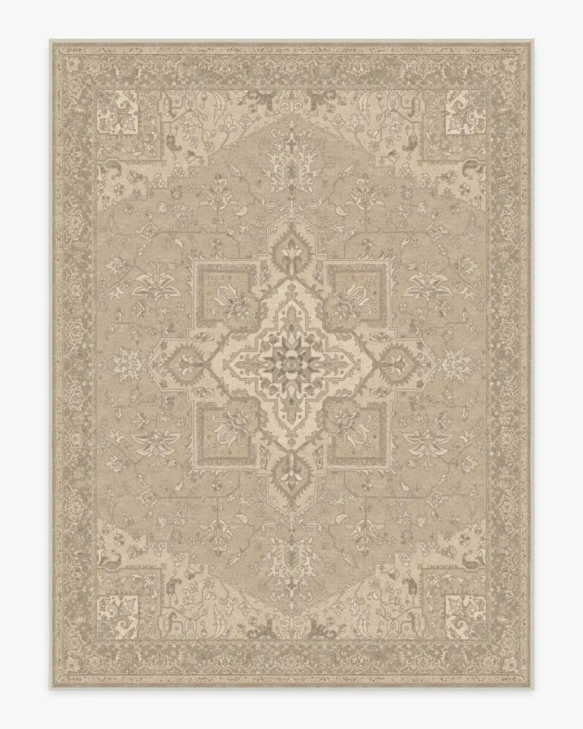 Add a stunning statement to your space with our Maral Heriz Creme Rug. A traditional Persian rug-inspired design, this rug features an ornate floral motif with borders, tinted in soft and sophisticated hues of taupe, almond milk and natural linen.