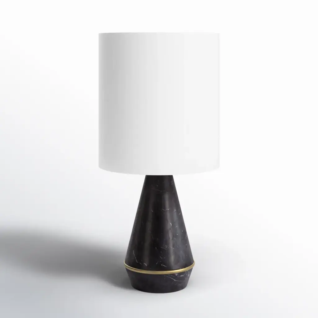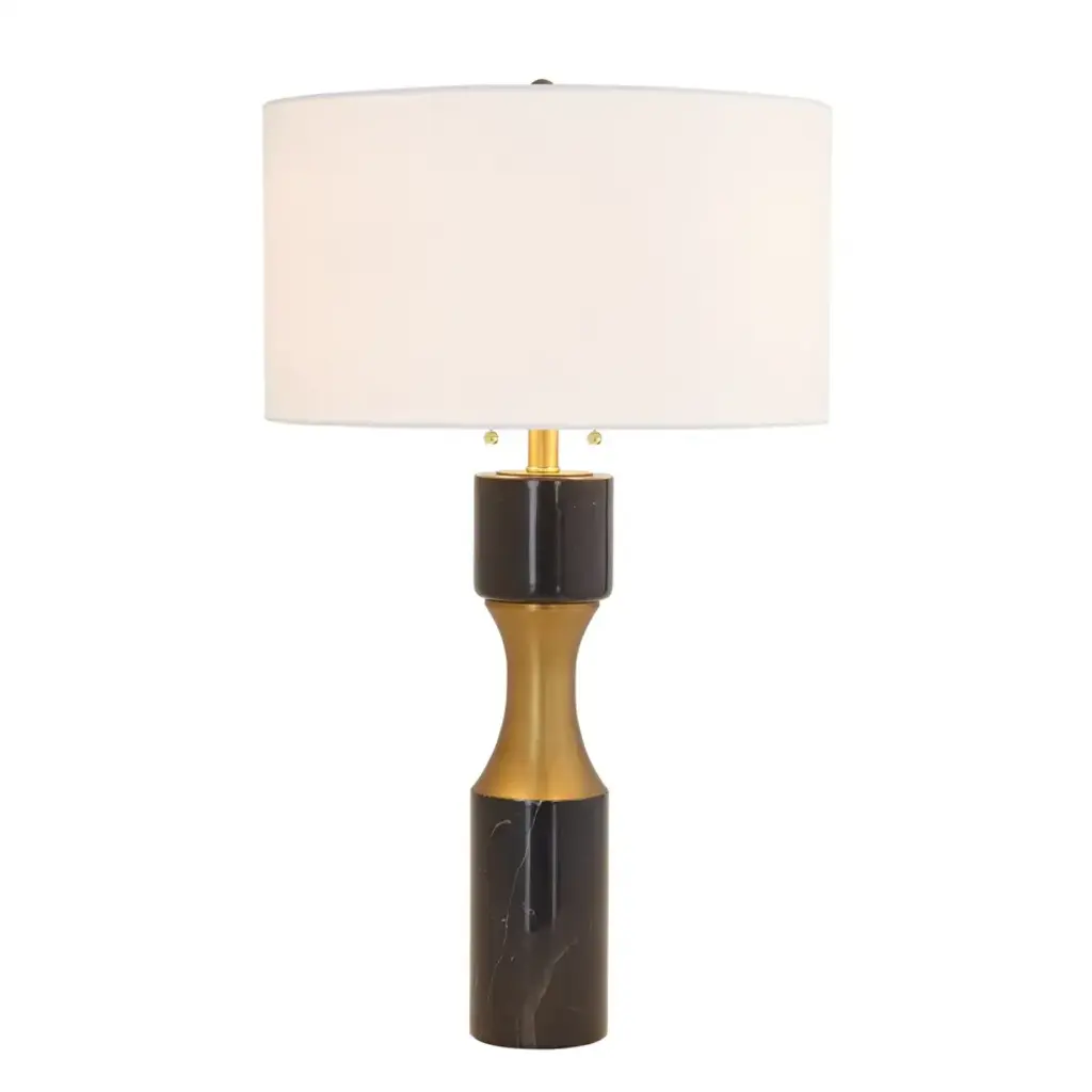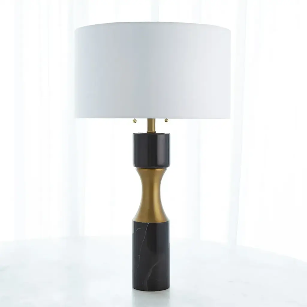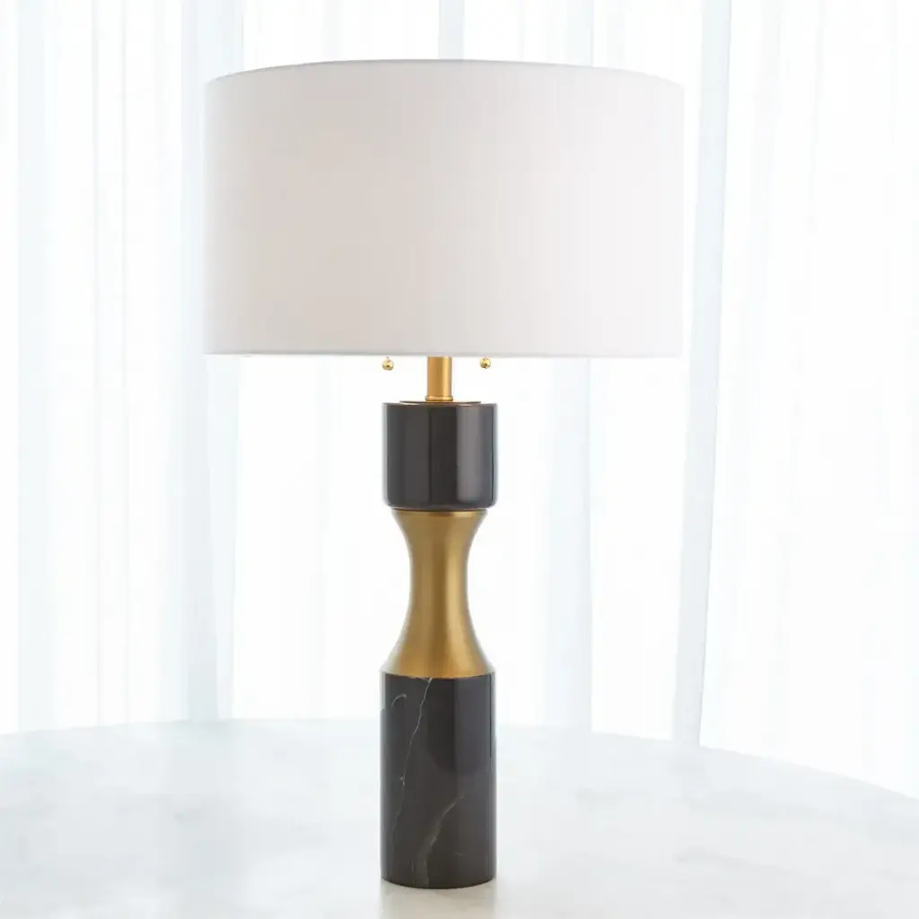 Similar to a corset, The Marble Cinch Lamp has a brass plated steel curved center between two layers of black marble. Holds two A bulbs, two pulls chains and a brass finial. Hardback fabric shade. Made of naturally quarried marble, color and veining variations may occur. From a fashion forward perspective, Global Views offers accessories, furniture, statement lighting, and an assortment of rugs and mirrors to add beauty and joy to your home.