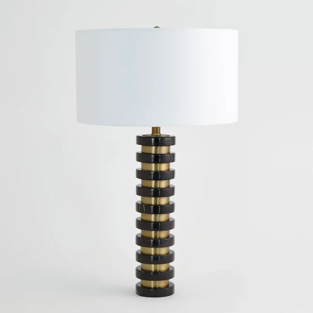 Stacked layers of black marble separated by collars of brass plated steel. Holds two A bulbs with two pull chains and a brass finial. Hardback fabric shade. Made of naturally quarried marble, color and veining variations may occur. From a fashion forward perspective, Global Views offers accessories, furniture, statement lighting, and an assortment of rugs and mirrors to add beauty and joy to your home.