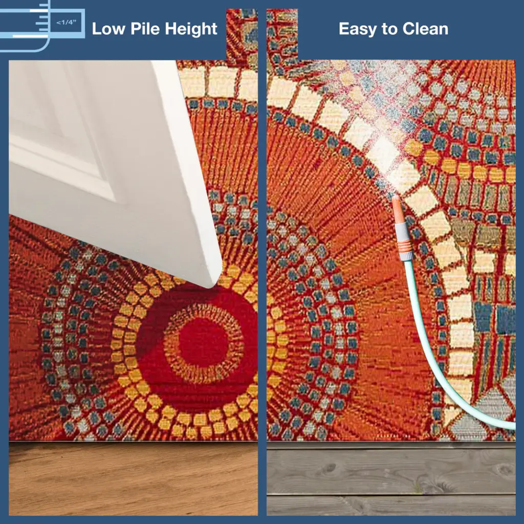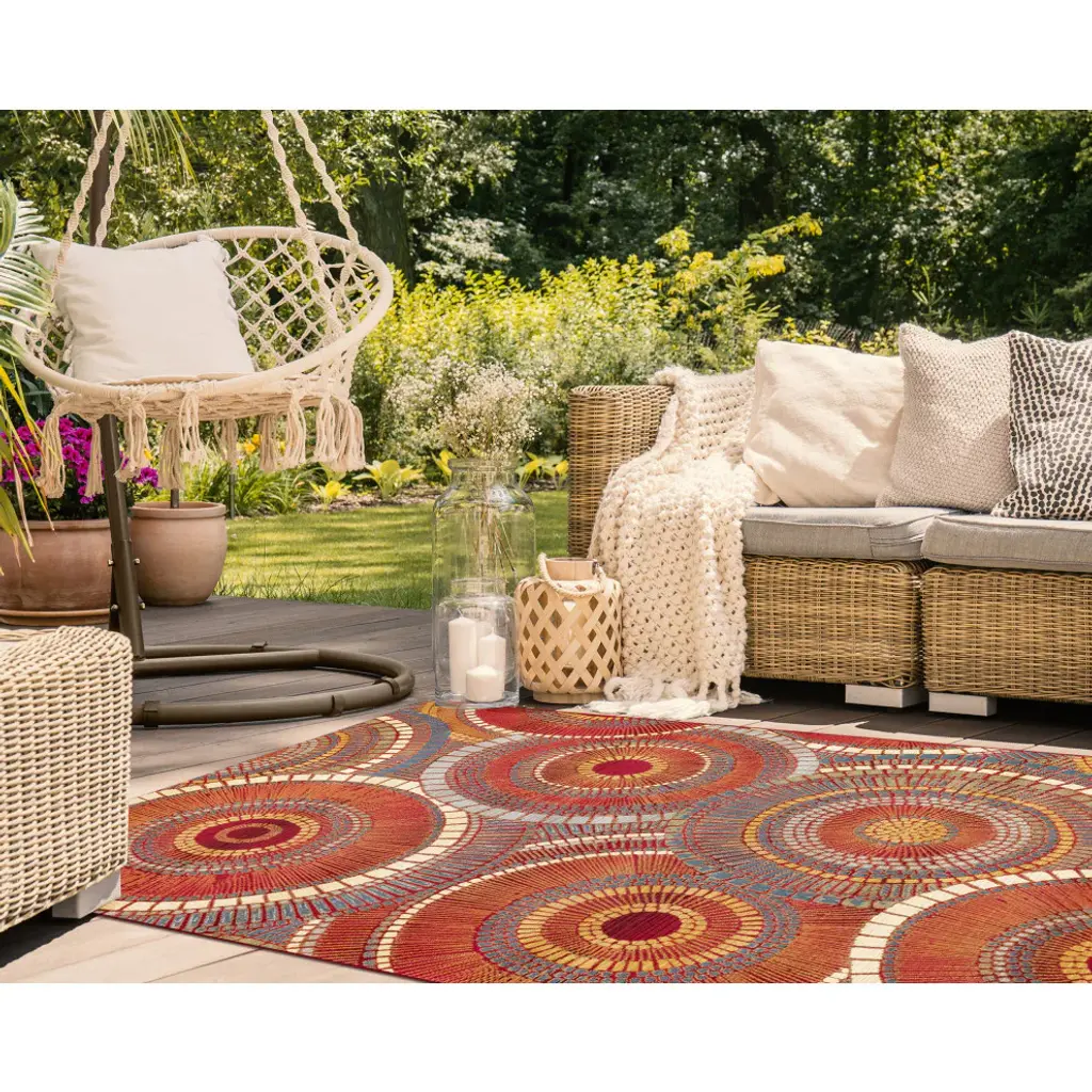 Add a sophistically playful touch to your space with these overlapping multicolored red, white, blue and yellow circles. The design is enhanced with the mosaic like effect created from the dots, lines and squares that join to create each larger circular shape. Bold in color, this stunning design is an effortless way to add style to your home. Made in Egypt from 100% polypropylene, the Marina Collection is Power Loomed to create intricate designs with a broad color spectrum and a high-quality finish. The material is flatwoven, low profile, weather resistant, UV stabilized for enhanced fade resistance, durable and ideal for those high traffic areas such as your patio, sunroom, kitchen, entryway, hallway, living room and bedroom making this the ideal indoor or outdoor rug. Detailed patterns are offered in an eclectic mix of styles ranging from tropical, coastal, geometric, contemporary and traditional designs; making these perfect accent rugs for your home. Limiting exposure to rain, moisture and direct sun will prolong rug life.Expertly machine crafted and imported from EgyptIntended for both Indoor and Outdoor UseMade from weather resistant 100% Polypropylene for high traffic areas and Indoor/Outdoor placement Pile height 0.12"Both Water and Fade ResistantBacking Material: LatexA contemporary design with shapes and colors that make an impact to compliment your indoor or outdoor spaceDesigned by Liora ManneA sophistically playful mosaic pattern featuring overlapping multicolored red, white, blue and yellow circlesRug Size: 3''3" x 4''11"