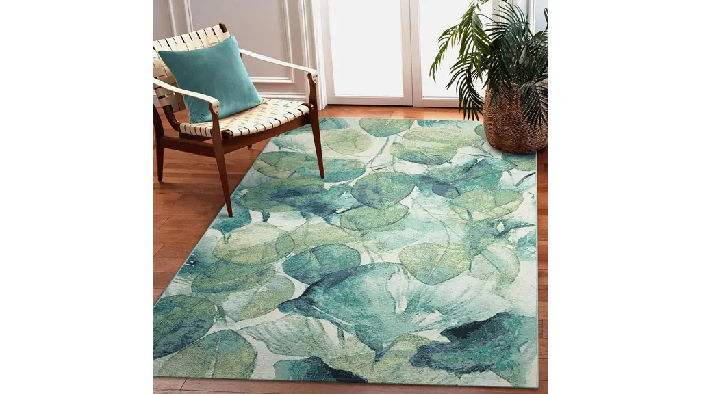 The Marina Lotus Indoor/Outdoor Area Rug features a collage of multicolored lotus leaves scattered on an ivory background. The botanical design brings a fresh nature feel to your indoor and outdoor space.