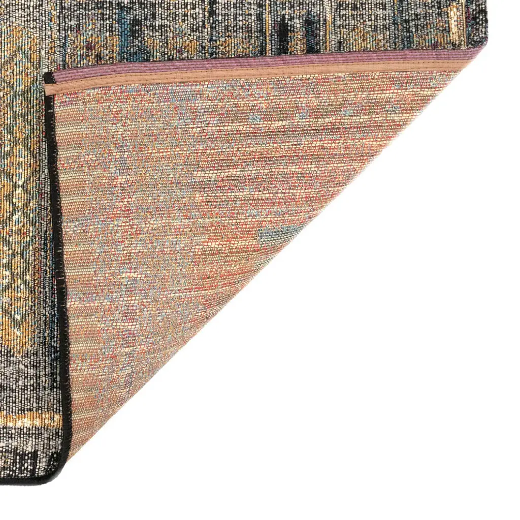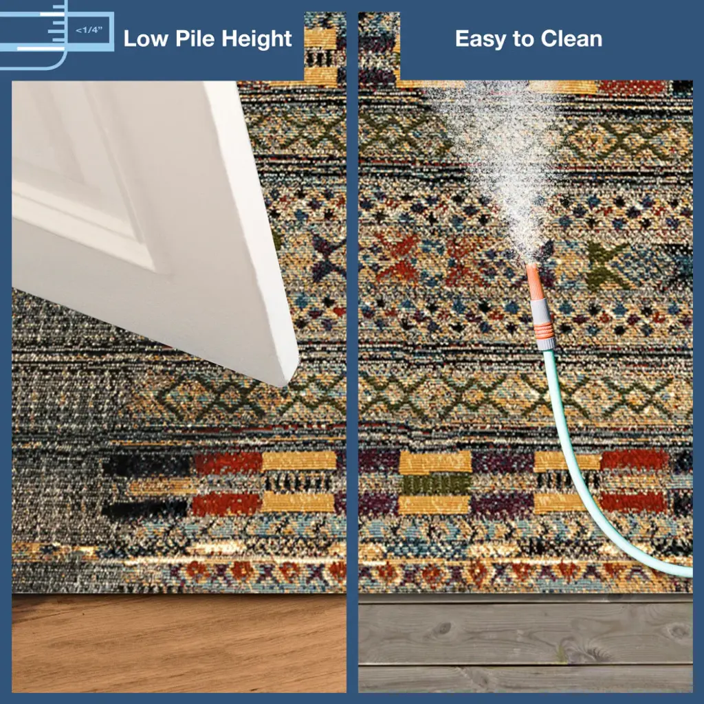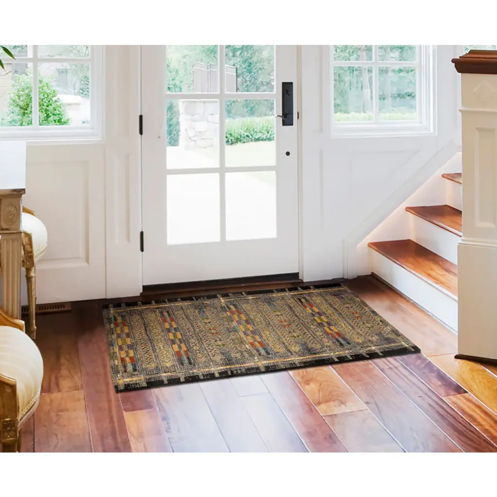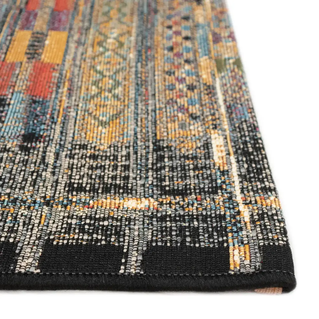 This area rug is inspired by traditional tribal designs that features linear patterns detailed with multiple colors and intricate shapes. The black background serves to highlight the vivid accent colors in yellow, red, purple and ivory to compliment its bold design, making this a truly unique piece for any space inside or outside your home.Made in Egypt from 100% polypropylene, the Marina Collection is Power Loomed to create intricate designs with a broad color spectrum and a high-quality finish. The material is flatwoven, low profile, weather resistant, UV stabilized for enhanced fade resistance, durable and ideal for those high traffic areas such as your patio, sunroom, kitchen, entryway, hallway, living room and bedroom making this the ideal indoor or outdoor rug. Detailed patterns are offered in an eclectic mix of styles ranging from tropical, coastal, geometric, contemporary and traditional designs; making these perfect accent rugs for your home. Limiting exposure to rain, moisture and direct sun will prolong rug life.Expertly machine crafted and imported from EgyptIntended for both Indoor and Outdoor UseMade from weather resistant 100% Polypropylene for high traffic areas and Indoor/Outdoor placement Pile height 0.12"Both Water and Fade ResistantBacking Material: LatexIntricate patterned details come together in this bold, tribal inspired design that compliments your contemporary indoor or outdoor spaceDesigned by Liora ManneA bold design with a bold black background with yellow, red, purple and ivory accent colors that highlight its bold designRug Size: 2''7" x 4''3"