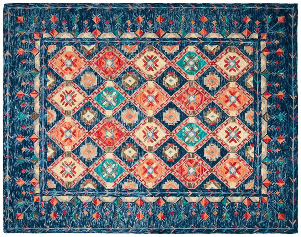 Step into a world of elegance with our exclusive 10' X 14' hand-tufted wool area rug, expertly crafted in the vibrant hues of navy and orange. This luxurious large rectangle rug, standing at a comfortable 1/4" height, is a masterpiece of traditional craftsmanship and contemporary design, tailored to elevate any room in your home. Meticulously made in India, our exquisite rug showcases a captivating geometric pattern that draws inspiration from timeless tribal motifs. The navy backdrop sets a deep, serene tone, while the pops of orange and accents of light blue, beige, and red breathe life and warmth into the design, creating a harmonious palette that complements both modern and classic interiors. The hand-tufted construction of pure wool promises not only a soft, plush texture underfoot but also durability that stands the test of time. Each fiber is carefully looped and cut to create a lush pile that offers both comfort and sophistication. Make a bold statement in your living space with this distinctive area rug. Its rich colors and intricate pattern work together to form a stunning focal point that will spark conversations and admiration for years to come. Experience the perfect blend of luxury, style, and tradition with this magnificent piece that is as functional as it is beautiful.