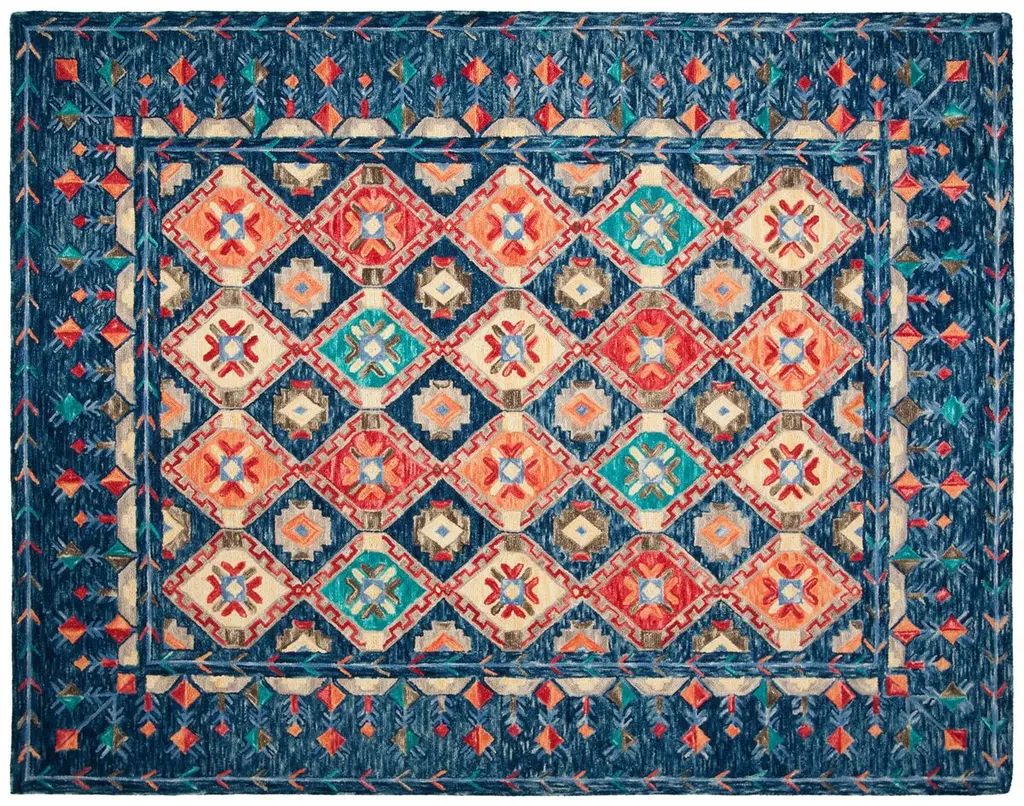 Step into a world of elegance with our exclusive 10' X 14' hand-tufted wool area rug, expertly crafted in the vibrant hues of navy and orange. This luxurious large rectangle rug, standing at a comfortable 1/4" height, is a masterpiece of traditional craftsmanship and contemporary design, tailored to elevate any room in your home. Meticulously made in India, our exquisite rug showcases a captivating geometric pattern that draws inspiration from timeless tribal motifs. The navy backdrop sets a deep, serene tone, while the pops of orange and accents of light blue, beige, and red breathe life and warmth into the design, creating a harmonious palette that complements both modern and classic interiors. The hand-tufted construction of pure wool promises not only a soft, plush texture underfoot but also durability that stands the test of time. Each fiber is carefully looped and cut to create a lush pile that offers both comfort and sophistication. Make a bold statement in your living space with this distinctive area rug. Its rich colors and intricate pattern work together to form a stunning focal point that will spark conversations and admiration for years to come. Experience the perfect blend of luxury, style, and tradition with this magnificent piece that is as functional as it is beautiful.