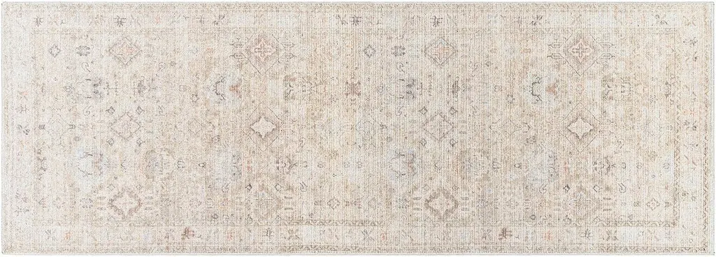 Bring elegance and style to any room with the Margaret area rug. This machine-woven piece from Turkey is crafted of polyester for a luxurious feel and features no pile, making it perfect for high traffic areas or outdoor spaces. The fringe detail adds an extra touch of sophistication to your space while also providing a long-lasting piece that will remain beautiful over time. Simply hose off with water and hang to dry for easy maintenance. For added cushioning, we recommend using a rug pad (sold separately).