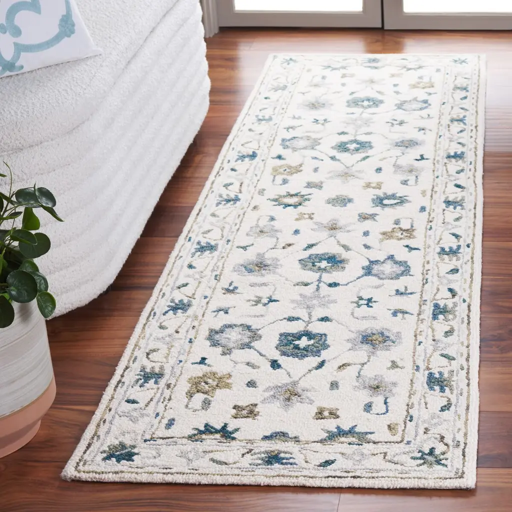 Elevate your living space with our exquisite area rug, designed to bring a touch of elegance to any room. Measuring 4 feet by 6 feet, this small rectangular masterpiece fits seamlessly into various spaces. The hand-tufted construction showcases a delicate floral pattern in soothing ivory and blue tones. Made in India, this rug blends 80 percent wool with 20 percent cotton, offering a cozy feel. The traditional style adds a classic charm, while its 0.5-inch height provides a comfortable texture underfoot. Embrace the timeless appeal of this beautiful piece and create a welcoming atmosphere in your home with ease.