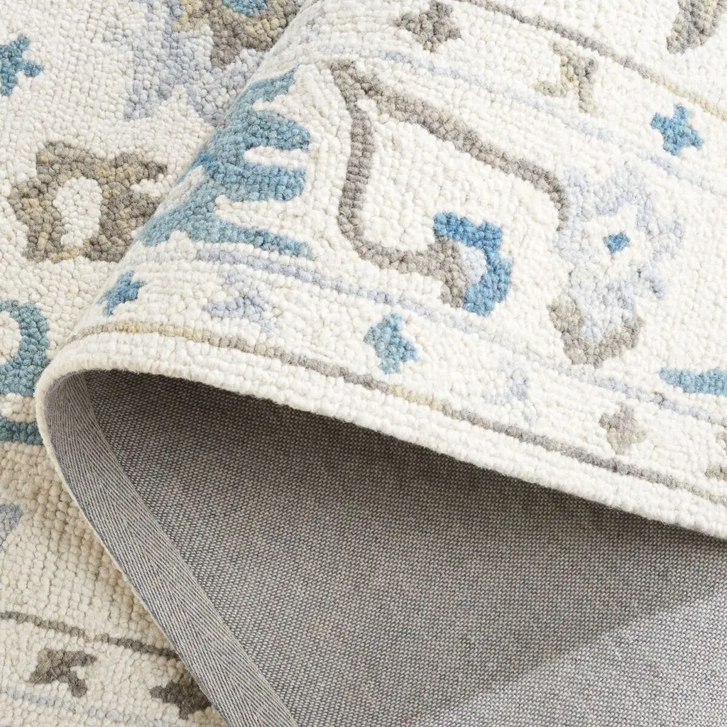 Elevate your living space with our exquisite area rug, designed to bring a touch of elegance to any room. Measuring 4 feet by 6 feet, this small rectangular masterpiece fits seamlessly into various spaces. The hand-tufted construction showcases a delicate floral pattern in soothing ivory and blue tones. Made in India, this rug blends 80 percent wool with 20 percent cotton, offering a cozy feel. The traditional style adds a classic charm, while its 0.5-inch height provides a comfortable texture underfoot. Embrace the timeless appeal of this beautiful piece and create a welcoming atmosphere in your home with ease.