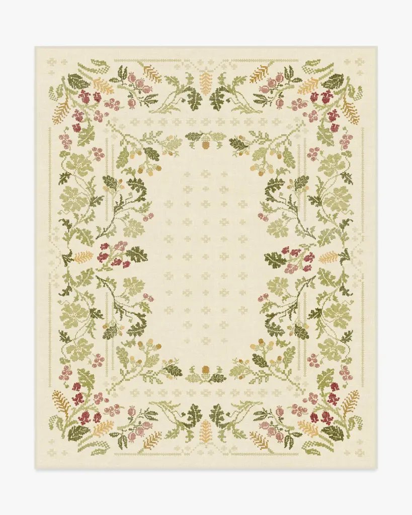 Botanical, but make it storybook. The Marlowe Ivory Multicolor Rug weaves together grapevines, oak leaves, acorns, and wildflowers in a layout that feels both collected and organic. With soft symmetry and natural spacing, the design strikes a balance between traditional and playful. Sage green, dusty rose, marigold, and soft terracotta pop against an ivory ground, creating a warm, inviting look with a hint of woodland charm. Water-resistant, stain-resistant, and machine-washable. Rug colors may vary slightly according to your device and the lighting in your space.