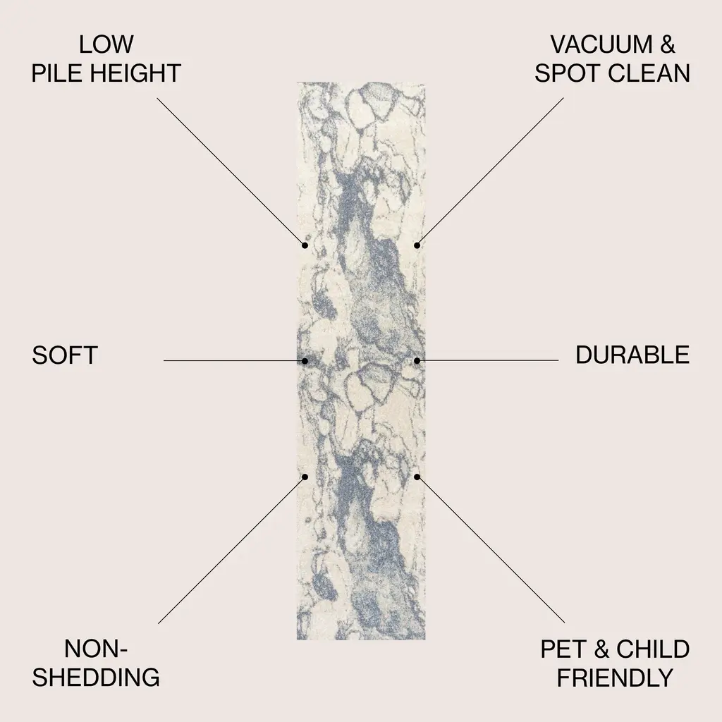 Inspired by the abstract designs of marble and stone, this bold rug has a modern, coastal vibe. A busy, overall pattern makes it perfect for homes with kids and pets. It's the perfect centerpiece for a mid-century modern, contemporary, beach house or minimalist interior.