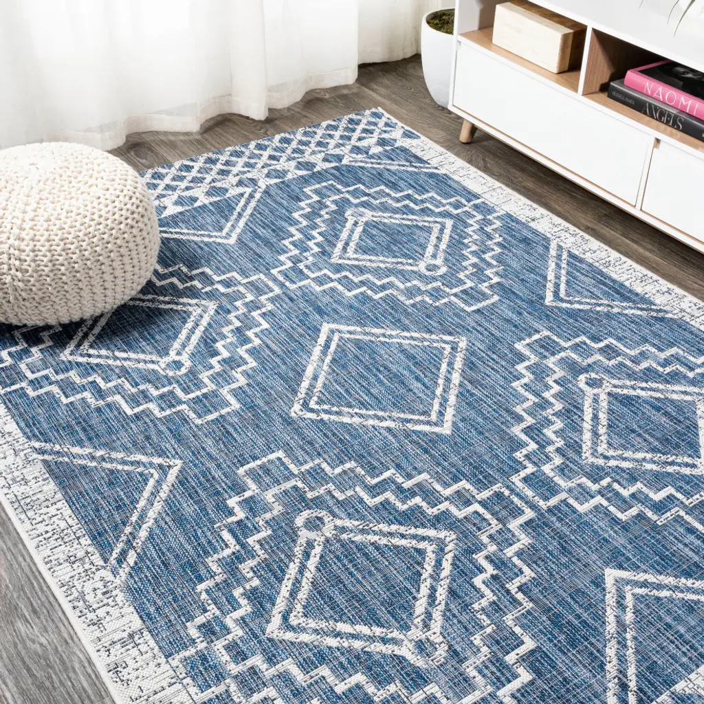 Moroccan influences abound in the geometric design of our tribal-inspired rug. Large diamond medallions bordered by trellis details create a bold pattern. Add graphic impact to a modern living room, dining room, bedroom, kitchen or entry and create your Boho-chic story. Features:• Power loomed with a 0. 19" pile that''s soft and durable• The crisp blue and ivory color scheme adds coastal cottage flair to a modern tribal design• Made from easy-care polypropylene - just sweep, vacuum or hose down with mild soap and water• 100% Polypropylene• No backing, use of rug pad is recommended (sold separately)• Power Loomed in Turkey• Actual Dimension: 4 ft. x 6 ft. • Color: Blue/Ivory• Thickness measures: 0. 19 in. • Available in multiple sizes and/or colorsRug Care:• Vacuum regularly and spot clean as needed; avoid direct and continuous exposure to sunlight; use brushless vacuum; remove spills immediately; if liquid, blot with clean, undyed cloth by pressing firmly around the spill to absorb as much as possible; for hard to remove stains, professional rug cleaning is recommended; store in a dry, well ventilated area and rotate for consistent wear• Packing and shipping may cause temporary creases in rugs, which will flatten out after a week on the floor; to expedite the process, try back-rolling your rug before laying it down, and then allow ample time for the remaining creases to relax• Please Note: Due to differences in monitors, some rug colors may vary slightly. Lengths and widths may vary from the published dimensions. Patterns may vary slightly according to shape and size selected. About us:Style your floors with JONATHAN Y. By combining fine craftsmanship and design, this New York creative studio is bringing fashion to your floors. The collection mixes sustainable organic materials, vibrant colors and trend worthy styles to create JONATHAN Y''s distinctive catalog of rugs.