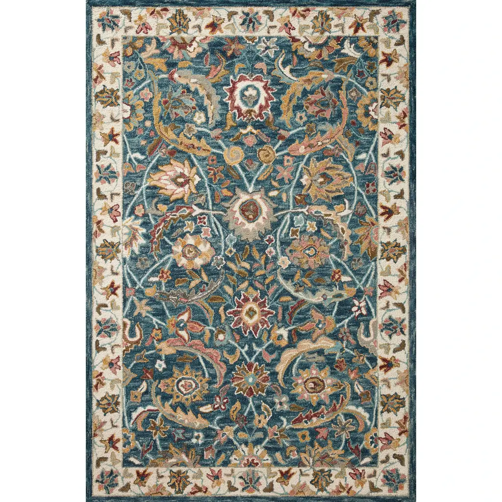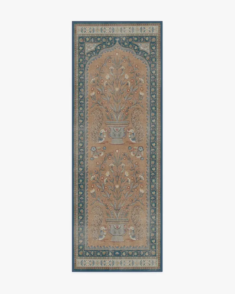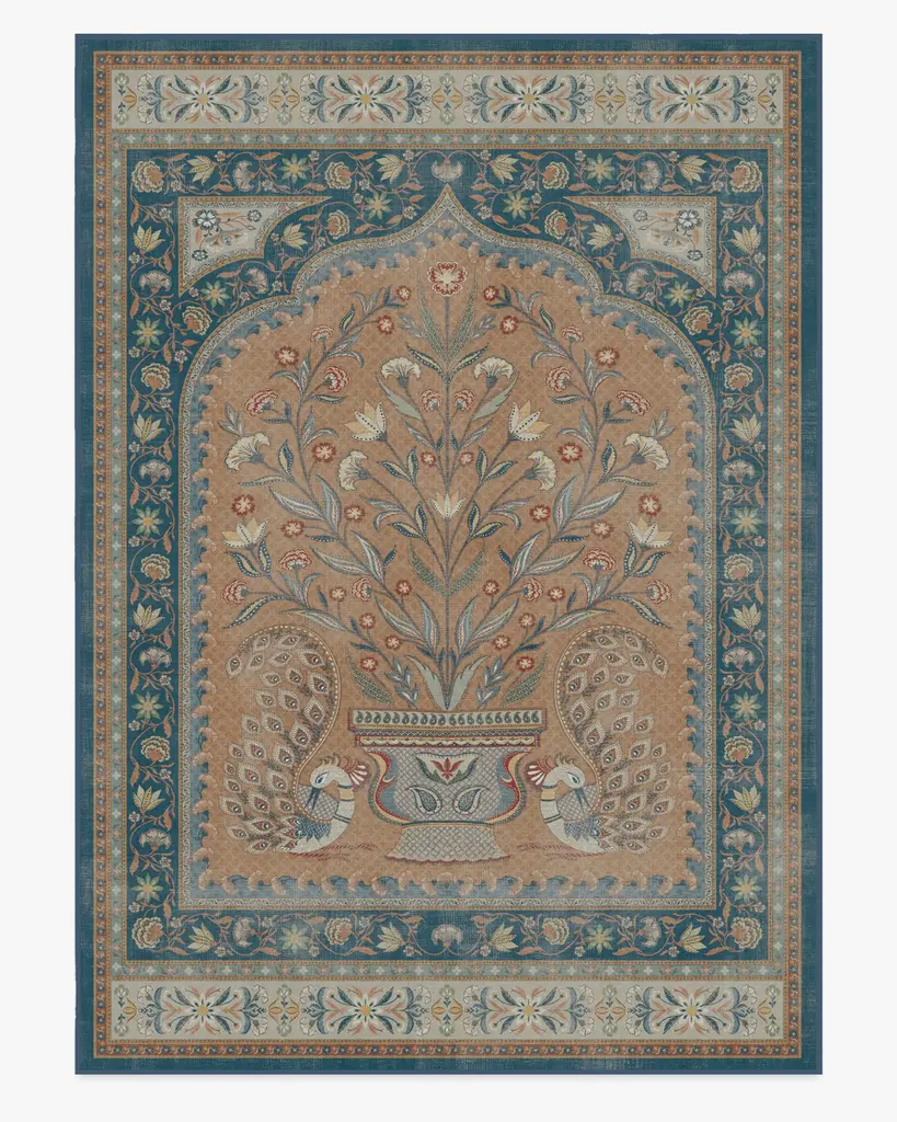 Welcome home majestic beauty with our Martyn Lawrence Bullard Mahal Multicolor Rug. Inspired by traditional woven Indian tapestries, this modern design features symmetric peacock motifs surrounding an elaborate floral bush, and intricate borders, creating an ethereal ambiance. The rich color palette, with variants of blues, creams, reds, pinks, golds, terracotta, and sage greens, is beautifully highlighted by pops of yellows and light creams against a coral background. Water-resistant, stain-resistant, and machine-washable. Rug colors may vary slightly according to your device and the lighting in your space.