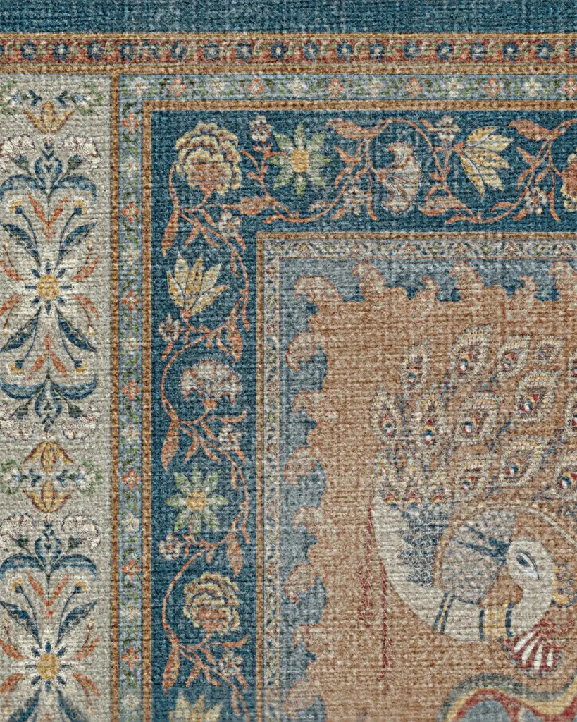 Welcome home majestic beauty with our Martyn Lawrence Bullard Mahal Multicolor Rug. Inspired by traditional woven Indian tapestries, this modern design features symmetric peacock motifs surrounding an elaborate floral bush, and intricate borders, creating an ethereal ambiance. The rich color palette, with variants of blues, creams, reds, pinks, golds, terracotta, and sage greens, is beautifully highlighted by pops of yellows and light creams against a coral background. Water-resistant, stain-resistant, and machine-washable. Rug colors may vary slightly according to your device and the lighting in your space.