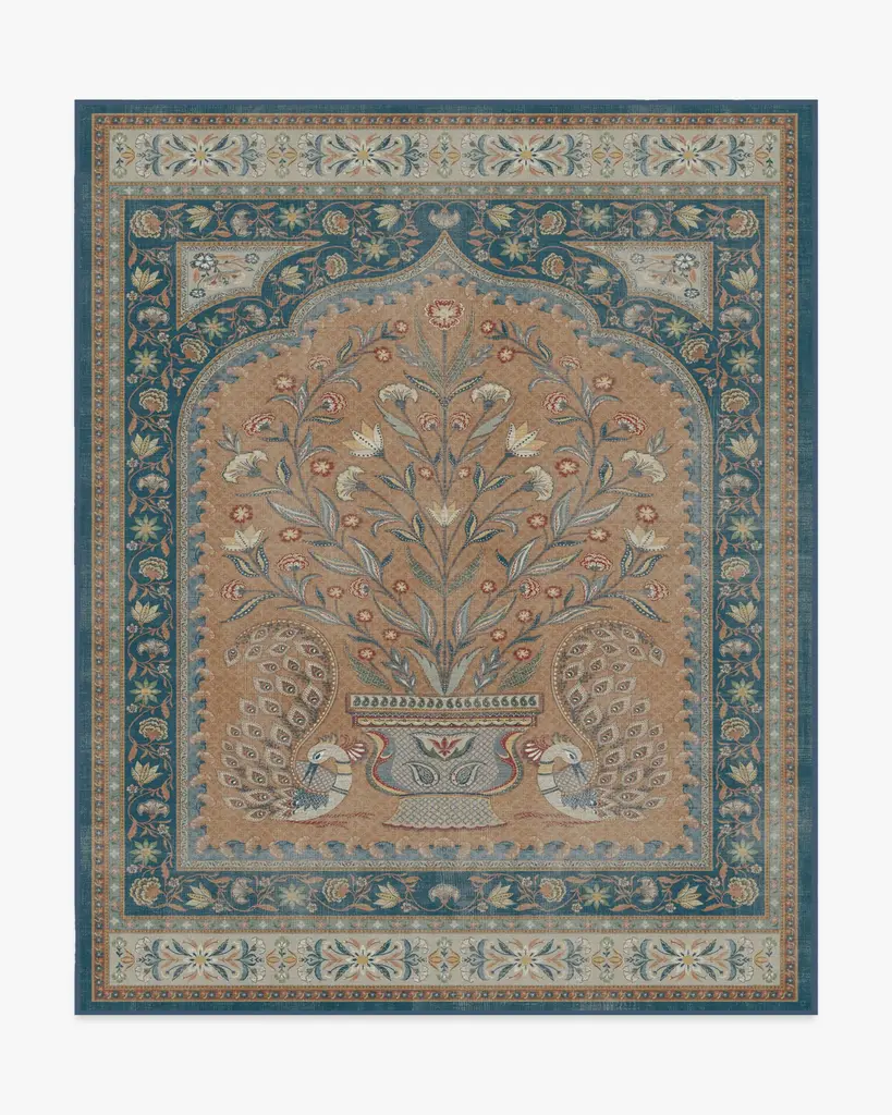 Welcome home majestic beauty with our Martyn Lawrence Bullard Mahal Multicolor Rug. Inspired by traditional woven Indian tapestries, this modern design features symmetric peacock motifs surrounding an elaborate floral bush, and intricate borders, creating an ethereal ambiance. The rich color palette, with variants of blues, creams, reds, pinks, golds, terracotta, and sage greens, is beautifully highlighted by pops of yellows and light creams against a coral background. Water-resistant, stain-resistant, and machine-washable. Rug colors may vary slightly according to your device and the lighting in your space.