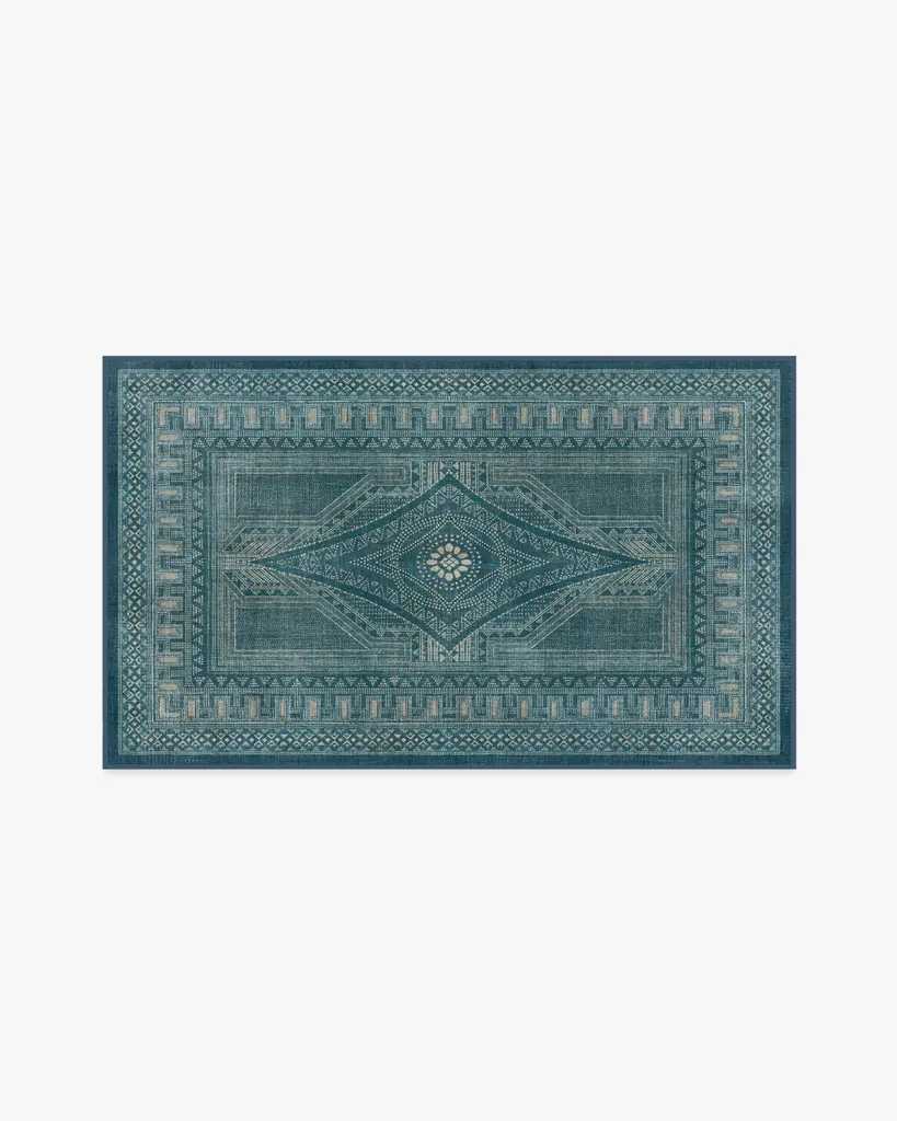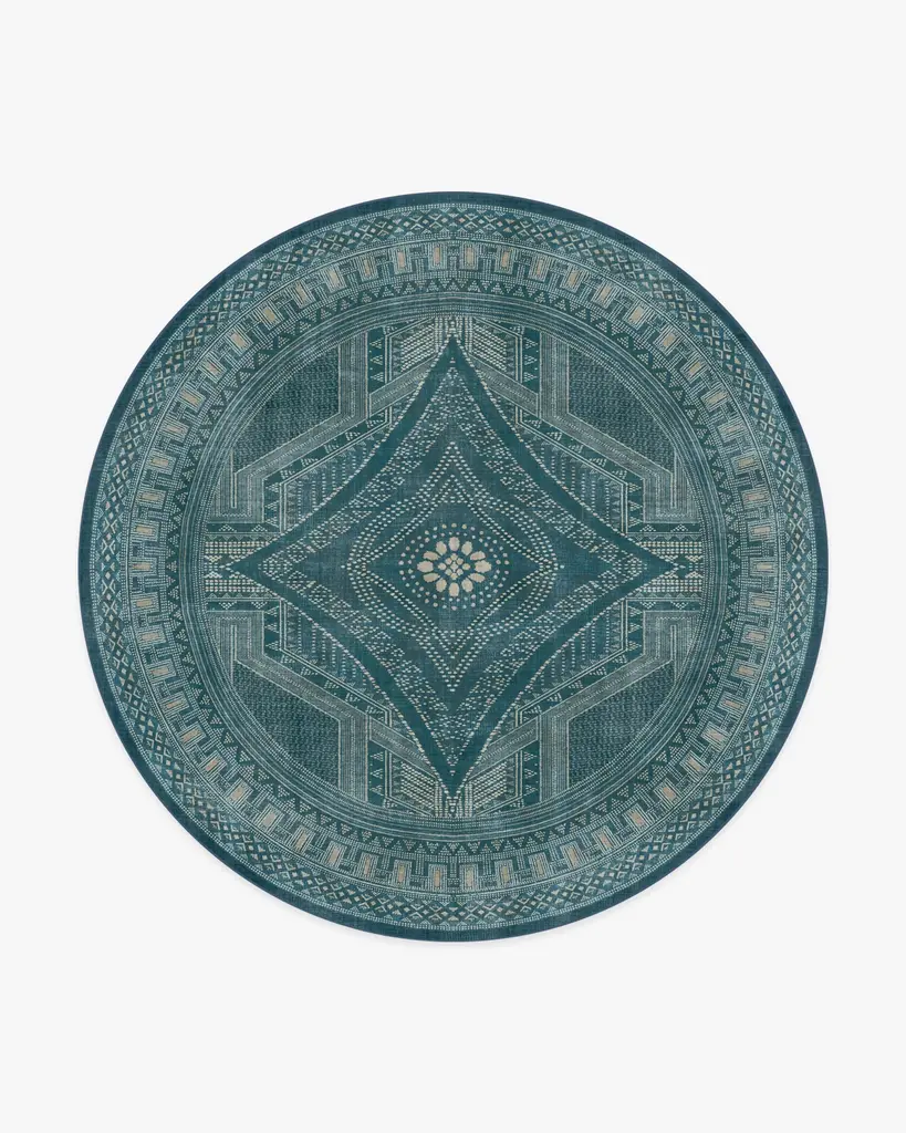 Add elegance and artistry to any room with our Martyn Lawrence Bullard Nomad Blue Rug. Inspired by beautifully designed block prints steeped in indigo, this symmetrical design translates Martyn Lawrence Bullard's Nomad prints into a classic medallion style. The rug, seemingly simple with its hues of blues, creams, and silvers, reveals hidden complexity through intricate details. Dots, dashes, and lines form fine patterns that captivate the eye. Water-resistant, stain-resistant, and machine-washable. Rug colors may vary slightly according to your device and the lighting in your space.