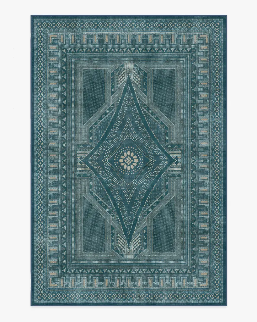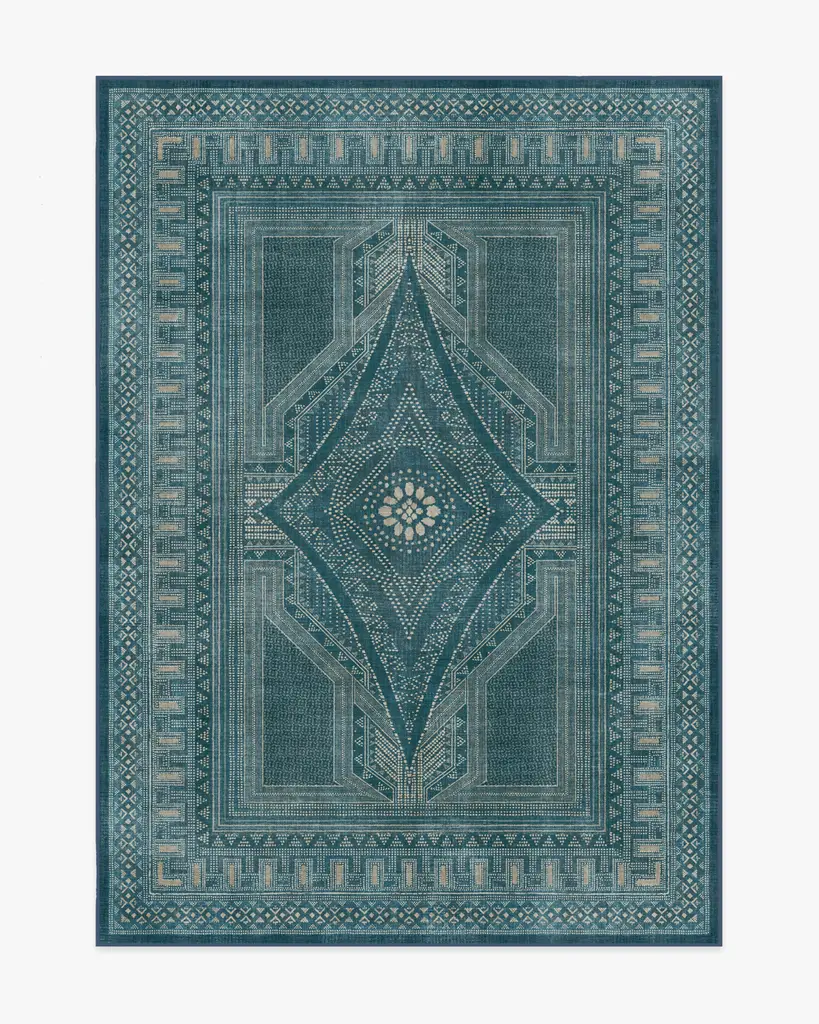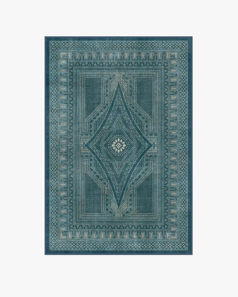 Add elegance and artistry to any room with our Martyn Lawrence Bullard Nomad Blue Rug. Inspired by beautifully designed block prints steeped in indigo, this symmetrical design translates Martyn Lawrence Bullard's Nomad prints into a classic medallion style. The rug, seemingly simple with its hues of blues, creams, and silvers, reveals hidden complexity through intricate details. Dots, dashes, and lines form fine patterns that captivate the eye. Water-resistant, stain-resistant, and machine-washable. Rug colors may vary slightly according to your device and the lighting in your space.