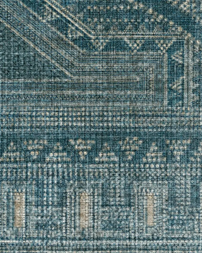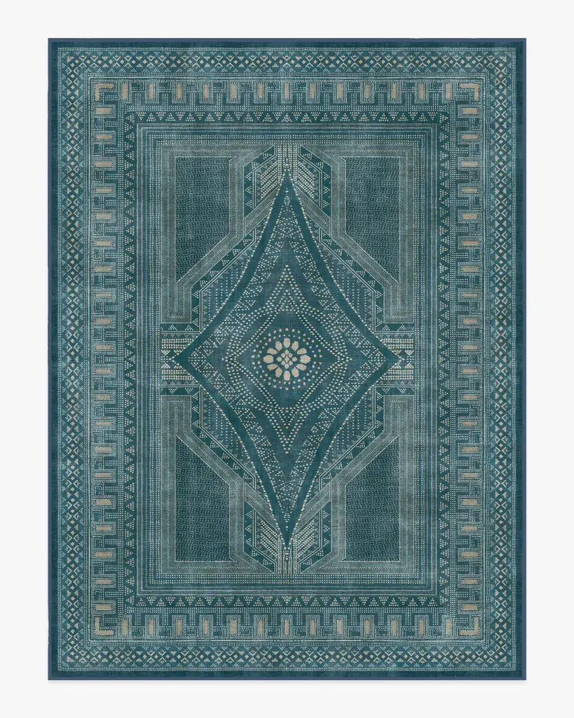 Add elegance and artistry to any room with our Martyn Lawrence Bullard Nomad Blue Rug. Inspired by beautifully designed block prints steeped in indigo, this symmetrical design translates Martyn Lawrence Bullard's Nomad prints into a classic medallion style. The rug, seemingly simple with its hues of blues, creams, and silvers, reveals hidden complexity through intricate details. Dots, dashes, and lines form fine patterns that captivate the eye. Water-resistant, stain-resistant, and machine-washable. Rug colors may vary slightly according to your device and the lighting in your space.