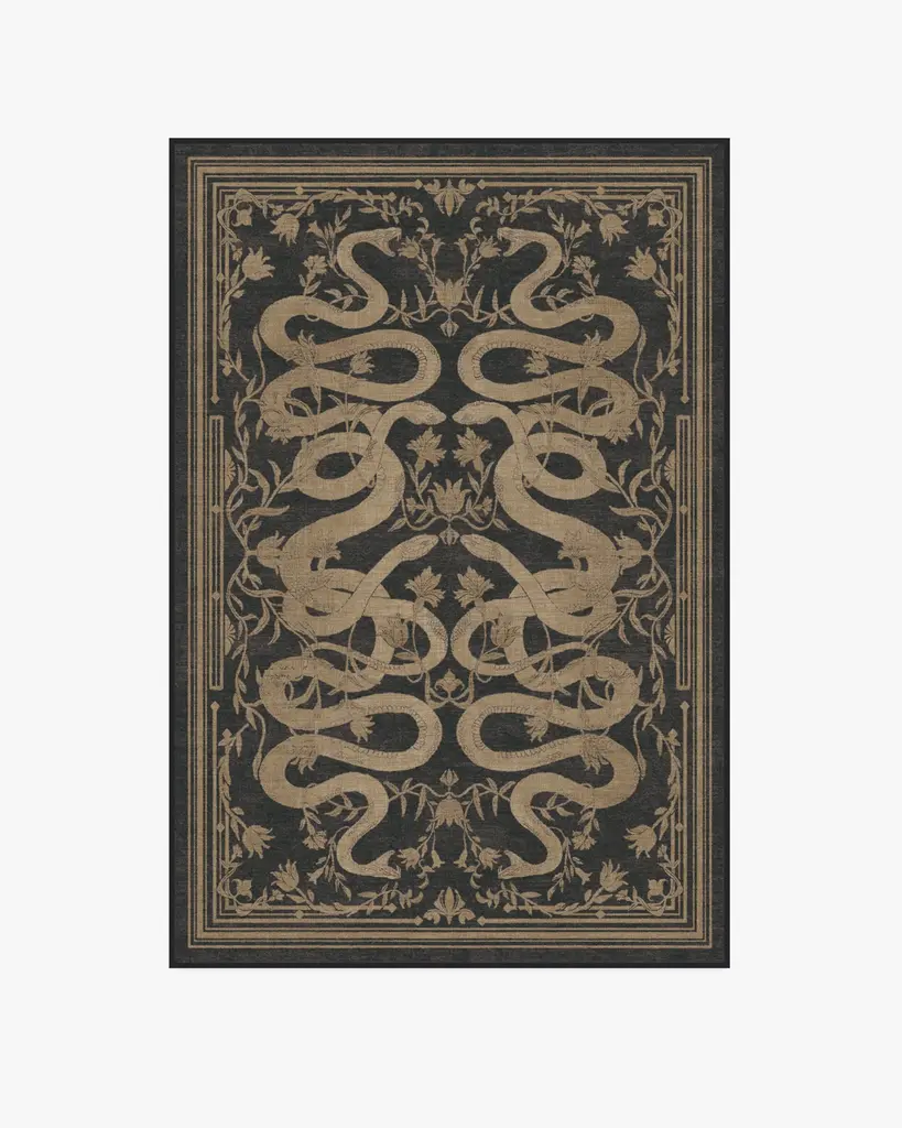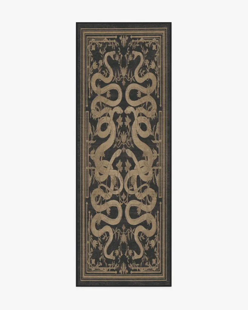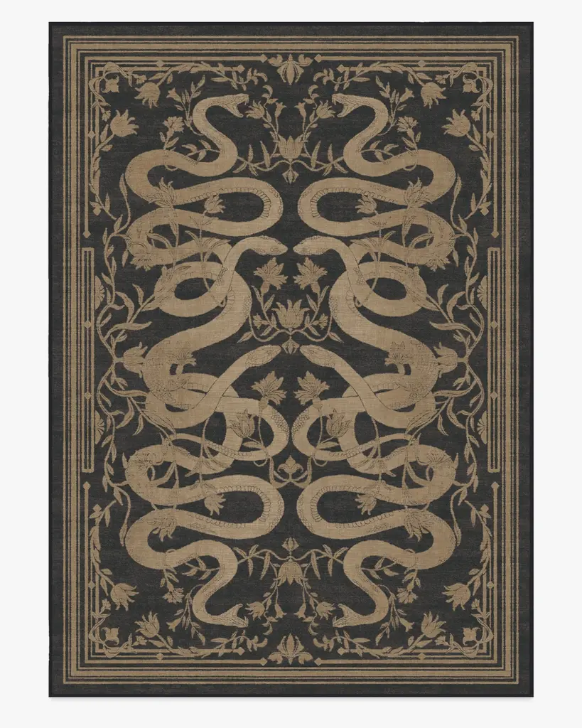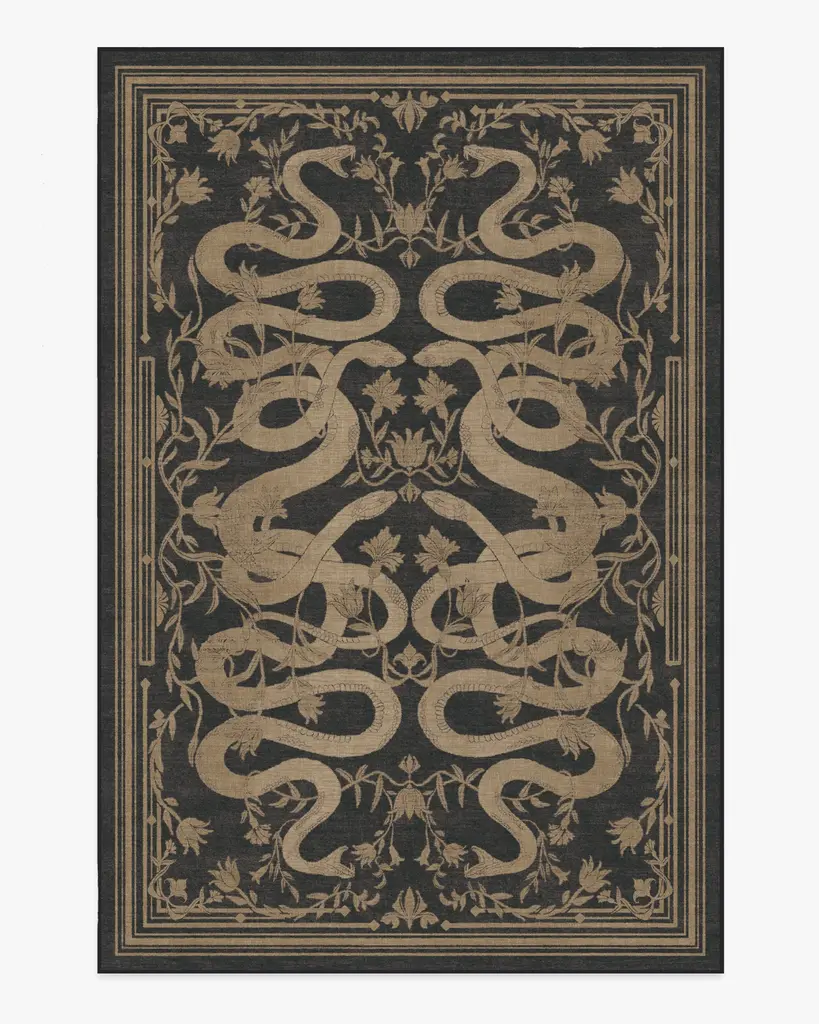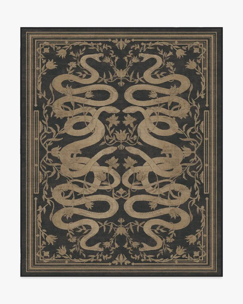 Watch stains slither away with our Martyn Lawrence Bullard Sumaya Soft Black Rug. Featuring bold and stylized mirrored snakes intertwining with intricate floral elements, this symmetrical design is complemented by a simple yet elegant decorative border. Variants of beiges and golds stand out beautifully against a deep black charcoal ground, creating a striking contrast. Water-resistant, stain-resistant, and machine-washable. Rug colors may vary slightly according to your device and the lighting in your space.