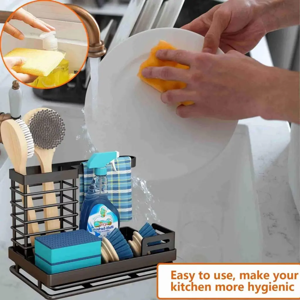 Sponge Holder for Kitchen Sink, Sink Caddy with High Brush Holder, Organizer Rustproof 304 Stainless Steel Dish Organizer Divider, Soap Dispenser Storage:A good storage helper for your home. Our sink caddy increases the extra storage space for storing sponges, brushes, hand wash, dish wash, and other kitchen bottles, which can make the kitchen countertop tidier. Also comes with a drip tray, which can collect dripping water from sponges, brushes and rugs to prevent the countertop from getting wet. Provide you a tidy clean kitchen. This sponge drain rack can also be used in kitchens, bathrooms, washstands and other places as you want to store your belongings.
