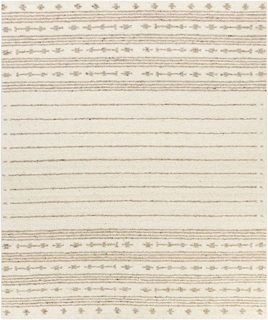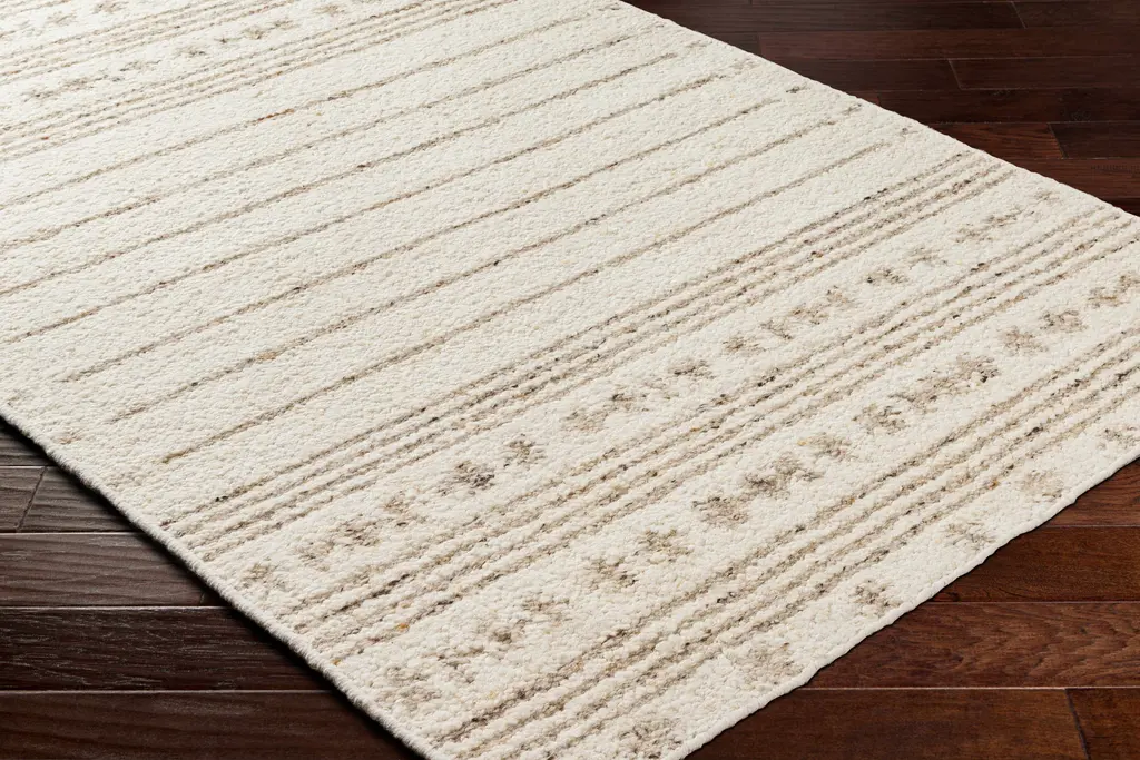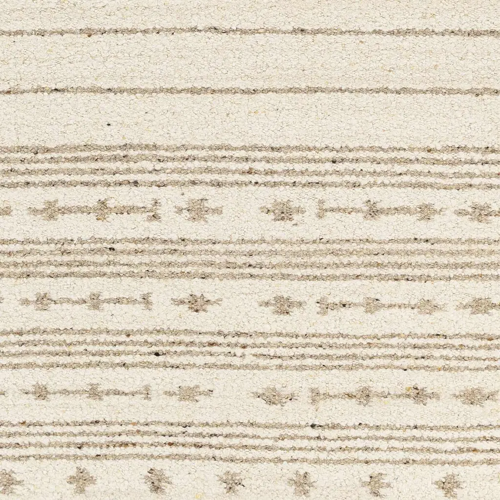 Collection: Matawan Colors: Cream, Charcoal, Black, Ivory, Dark Red, Dark Brown Construction: Hand Woven Material: 90% Wool,10% Polyester Pile: No Pile Styles: Transitional, Bohemian Made In: India Thickness: 0.5" Price Range: $$$$$ (Premium)