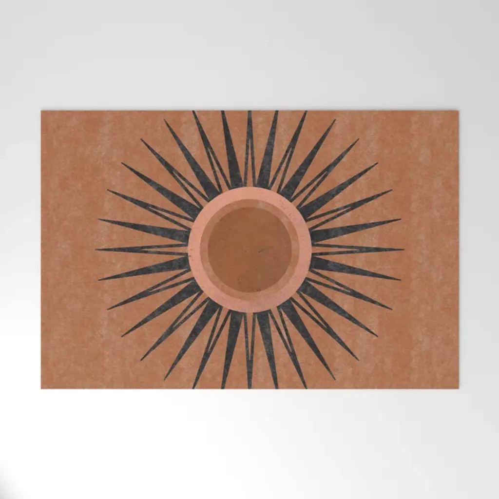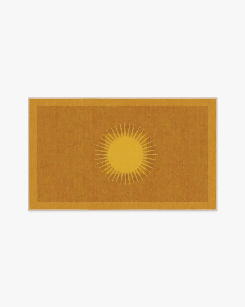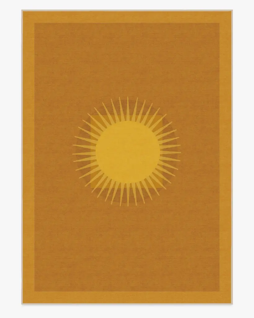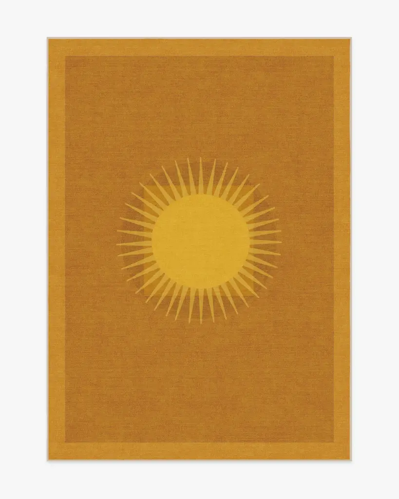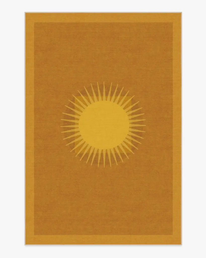 Sun-drench your favorite room with our Matthew Williamson Helios Gold Rug. Inspired by Matthew’s travels to Spain, this beaming design combines warm, minimalist shapes that mimic a retro aesthetic. The light yellow border and warm yellow medallion radiate against a deep ochre background. Water-resistant, stain-resistant, and machine-washable. Rug colors may vary slightly according to your device and the lighting in your space.