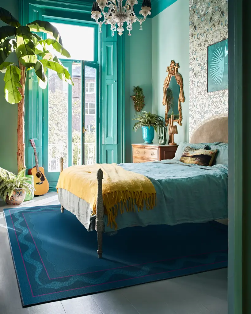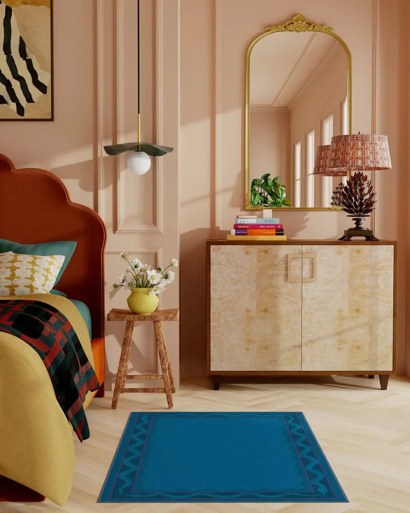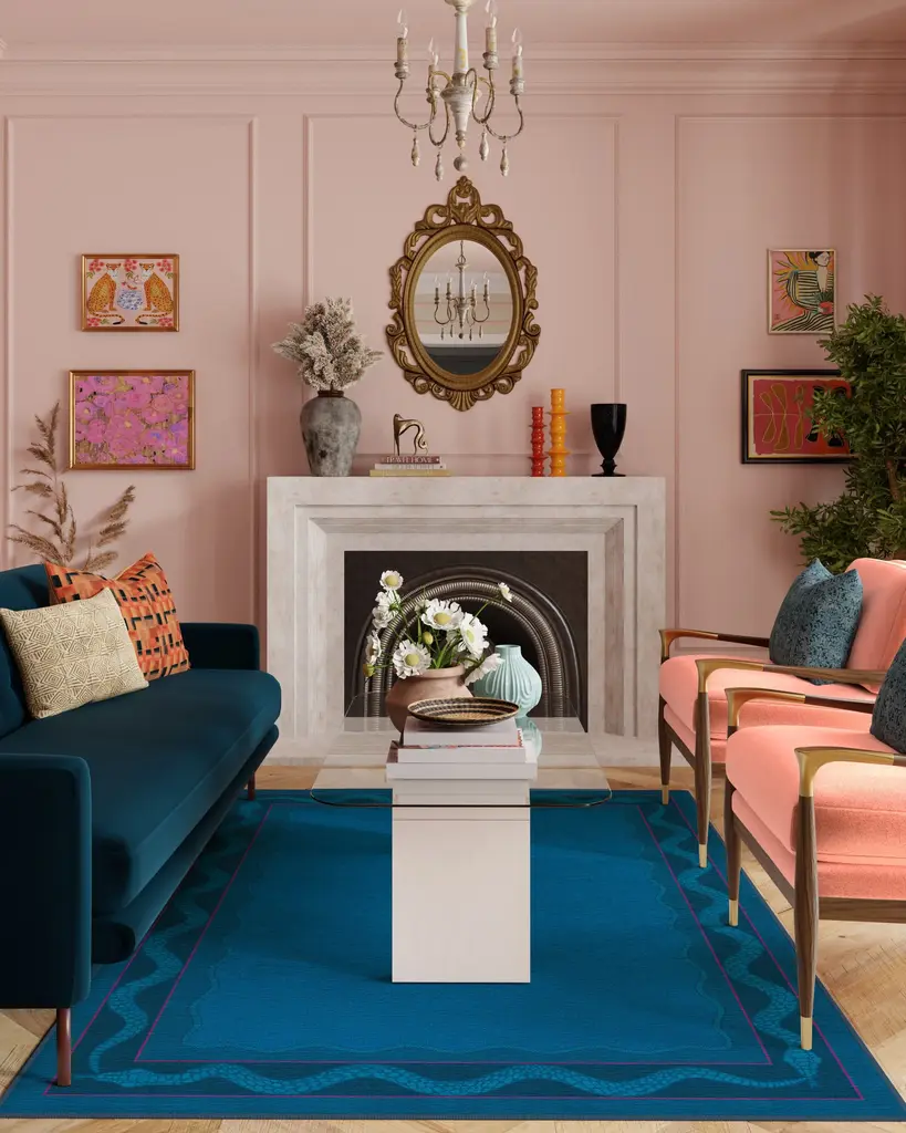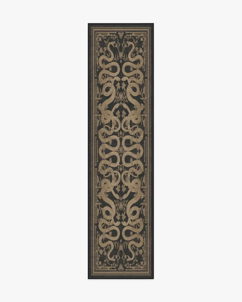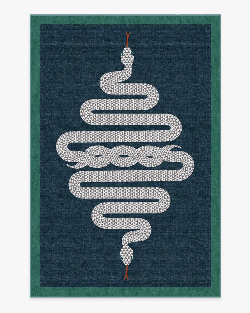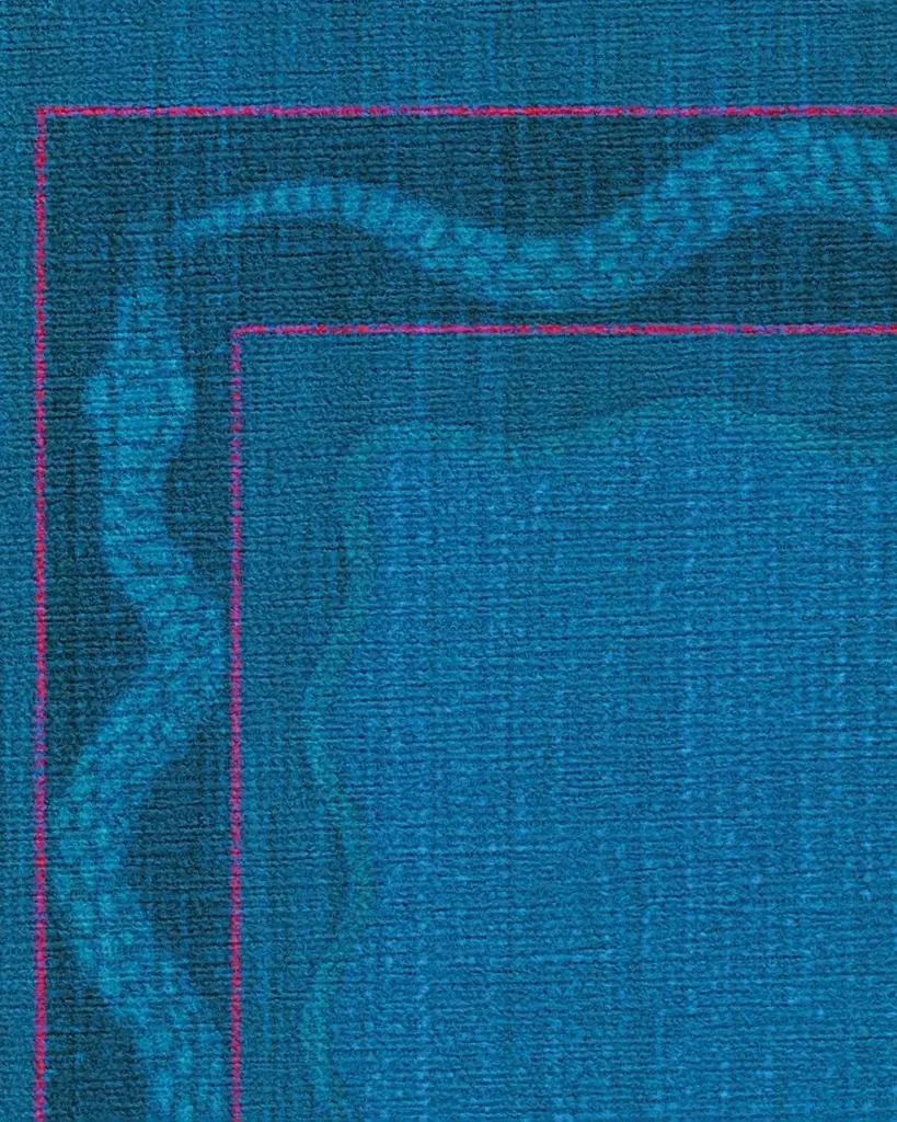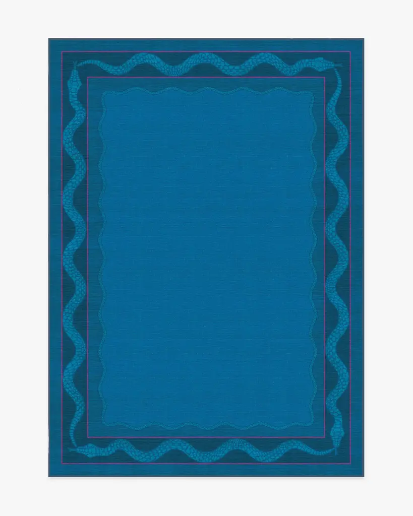 Expression is everything with our Matthew Williamson Serpent Border Azure Rug. Inspired by the sinuous curves of a snake, this slithering design features four serpents weaving gracefully around the rug’s edge, framed by intricate geometric borders. Deep and medium blue tones boldly ground the design, while pops of magenta add a vibrant contrast. Water-resistant, stain-resistant, and machine-washable. Rug colors may vary slightly according to your device and the lighting in your space.