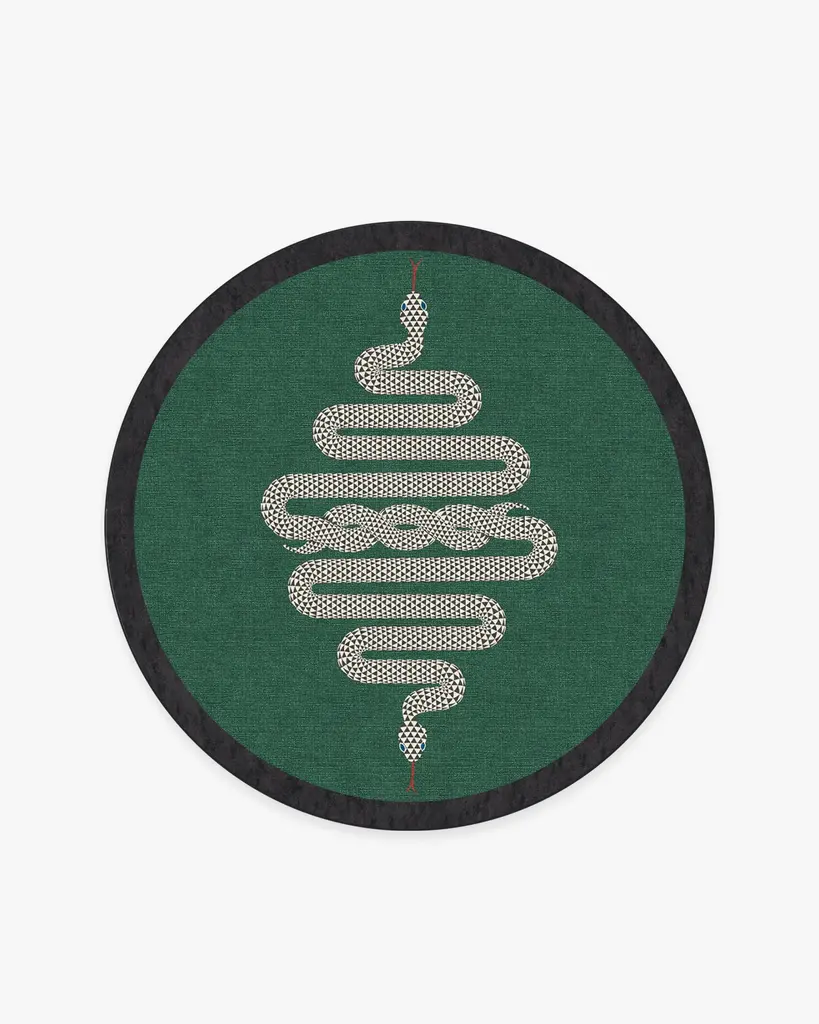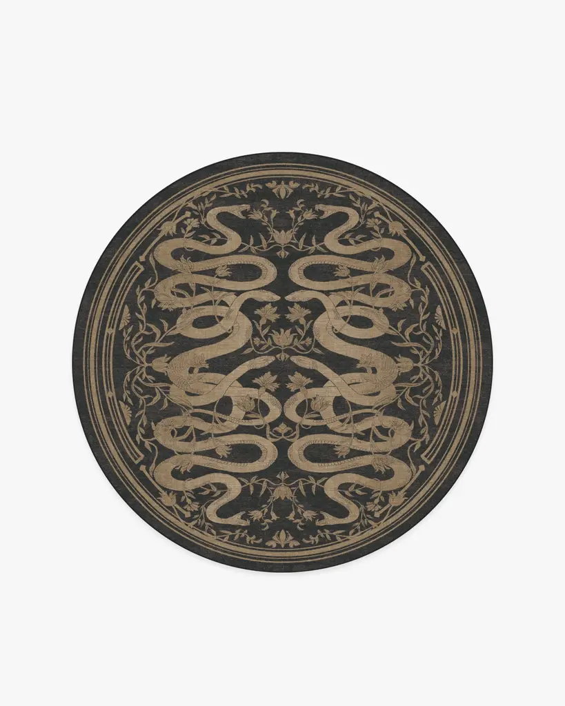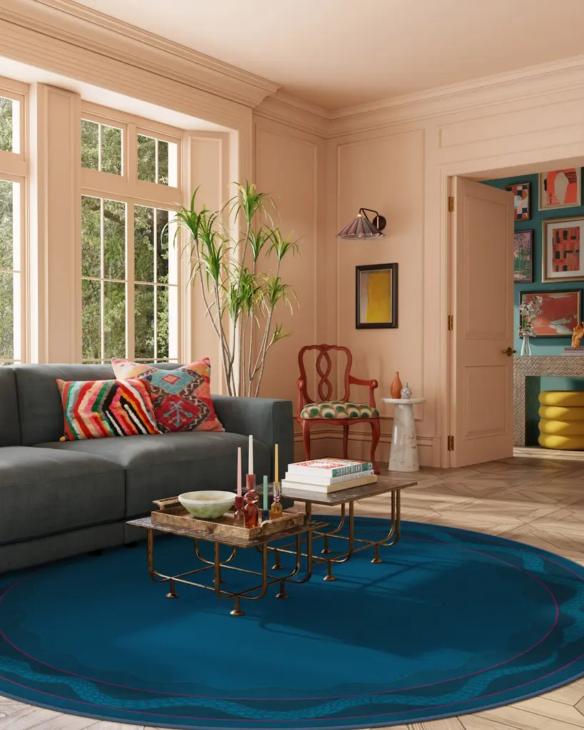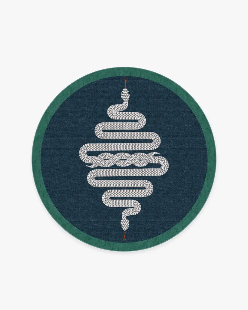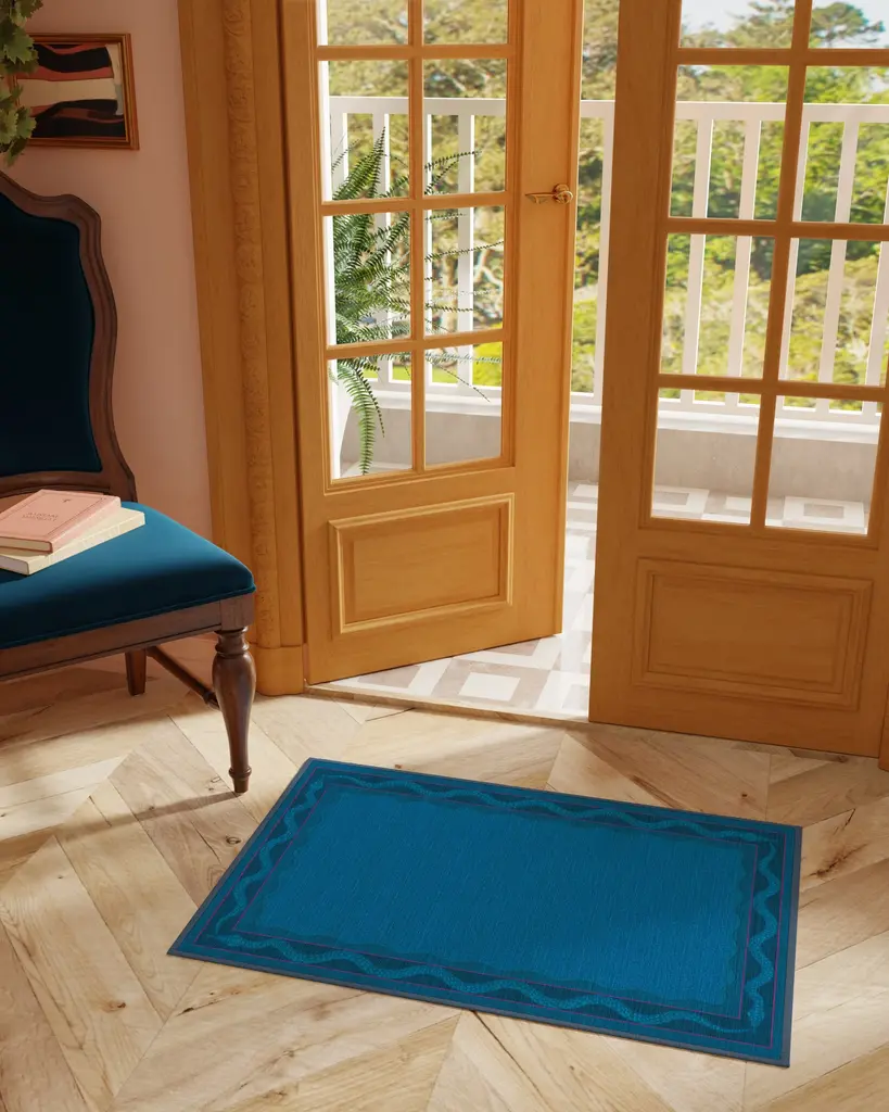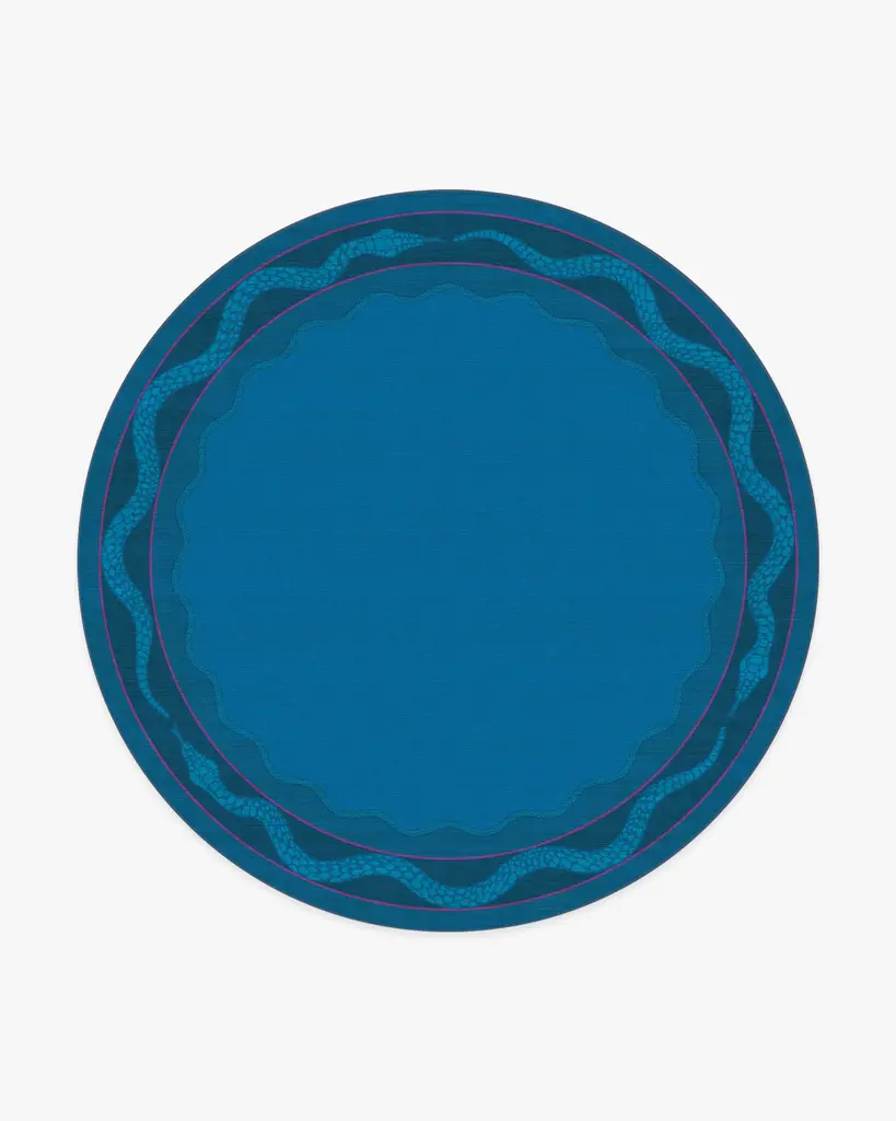 Expression is everything with our Matthew Williamson Serpent Border Azure Rug. Inspired by the sinuous curves of a snake, this slithering design features four serpents weaving gracefully around the rug’s edge, framed by intricate geometric borders. Deep and medium blue tones boldly ground the design, while pops of magenta add a vibrant contrast. Water-resistant, stain-resistant, and machine-washable. Rug colors may vary slightly according to your device and the lighting in your space.
