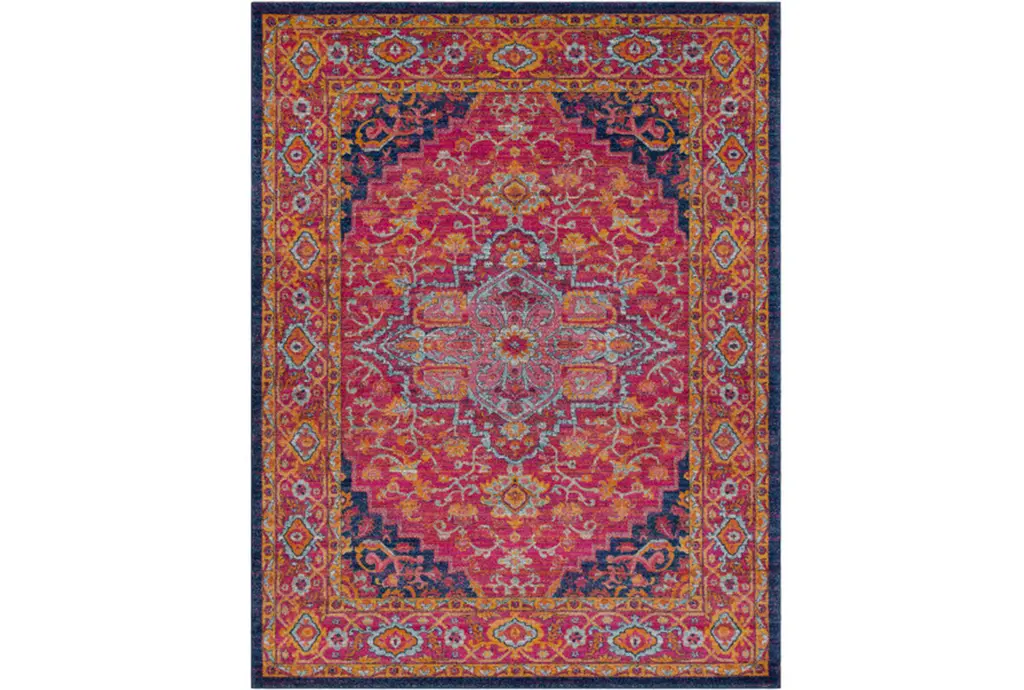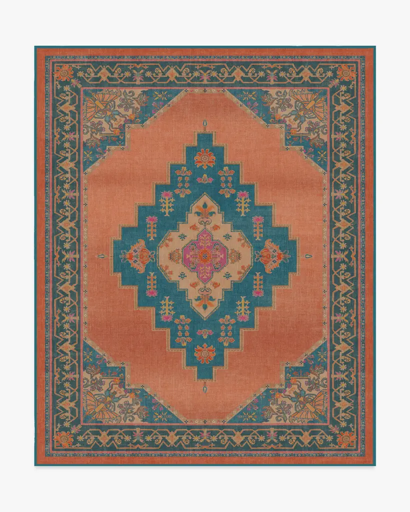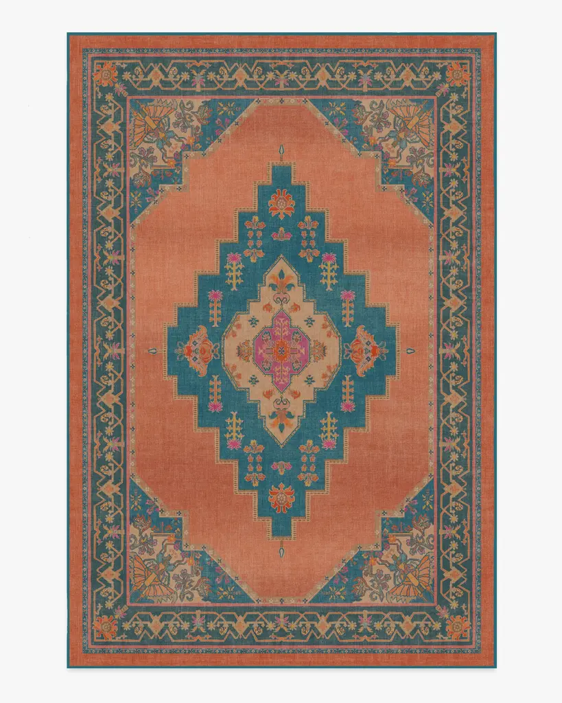 Bring global exploration right into your home with our Matthew Williamson Sunset Bazaar Rug. Inspired by textiles Matthew found in Spain and Morocco, this design features a large-scale medallion, subtle leopard print, and palm tree motifs. The striking teal medallion and border stand out against a vivid rust background, while pops of magenta, coral, and bright yellows add a lively contrast. Water-resistant, stain-resistant, and machine-washable. Rug colors may vary slightly according to your device and the lighting in your space.