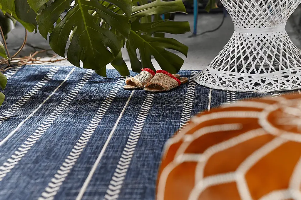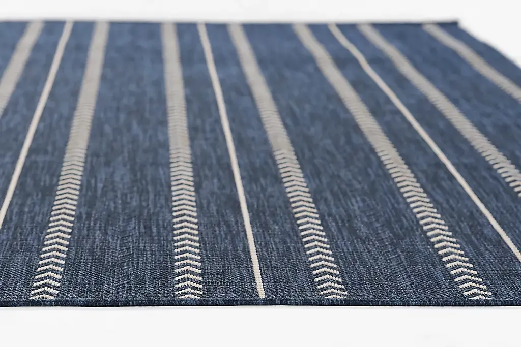 Effortlessly blending calm focus with dynamic energy, the relaxed flow of the Mavi rug brings serene rhythm to moments of rest. A field of cool navy blue is divided by white lines and rows of chevrons facing in the same direction. 100% Polypropylene.