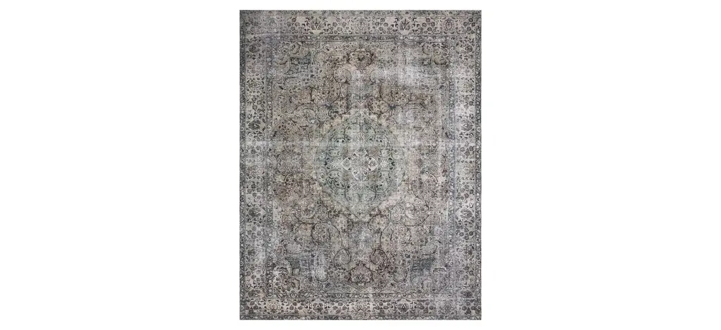 Inspired by traditional European and Persian motifs. Our Maxine Dusk Blue Rug features a gently distressed diamond medallion with delicate floral and leaf details in tones of slate blue, beige, and teal.