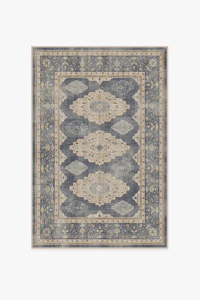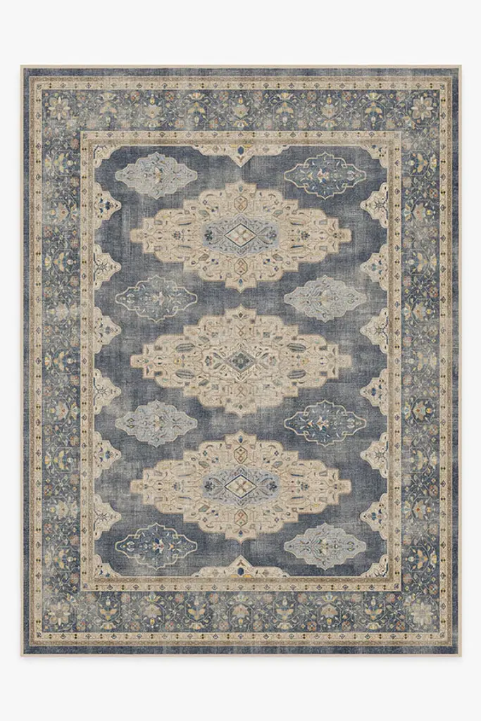 Inspired by traditional European and Persian motifs. Our Maxine Dusk Blue Rug features a gently distressed diamond medallion with delicate floral and leaf details in tones of slate blue, beige, and teal. Water-resistant, stain-resistant, and machine-washable.