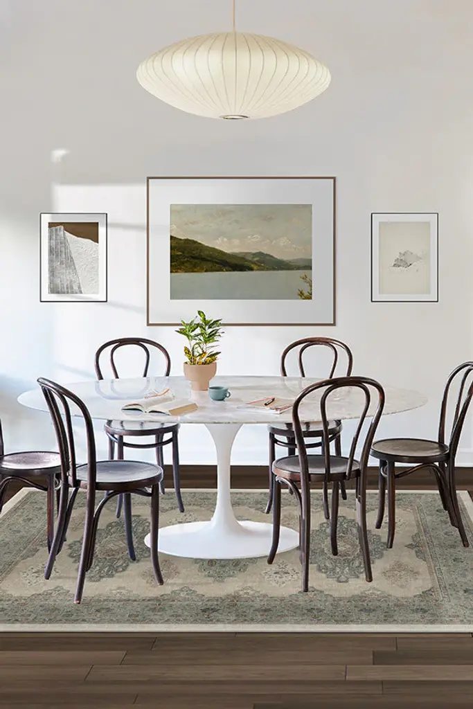 Inspired by traditional European and Persian motifs. Our Maxine Natural Sage Rug features a gently distressed diamond medallion with delicate floral and leaf details in tones of beige and muted green.