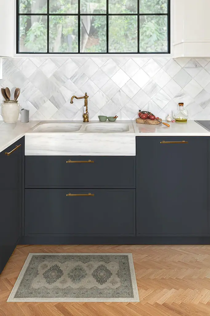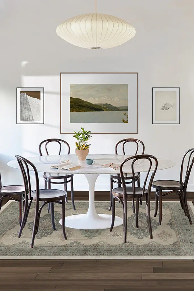 Inspired by traditional European and Persian motifs. Our Maxine Natural Sage Rug features a gently distressed diamond medallion with delicate floral and leaf details in tones of beige and muted green. Water-resistant, stain-resistant, and machine-washable.