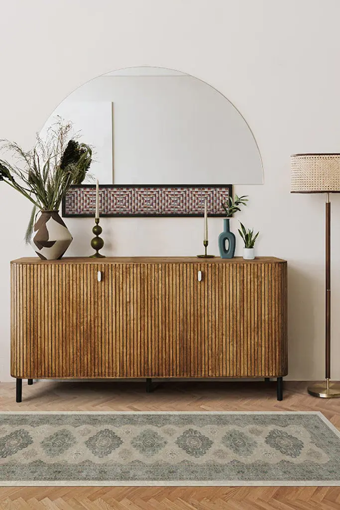 Inspired by traditional European and Persian motifs. Our Maxine Natural Sage Rug features a gently distressed diamond medallion with delicate floral and leaf details in tones of beige and muted green. Water-resistant, stain-resistant, and machine-washable.