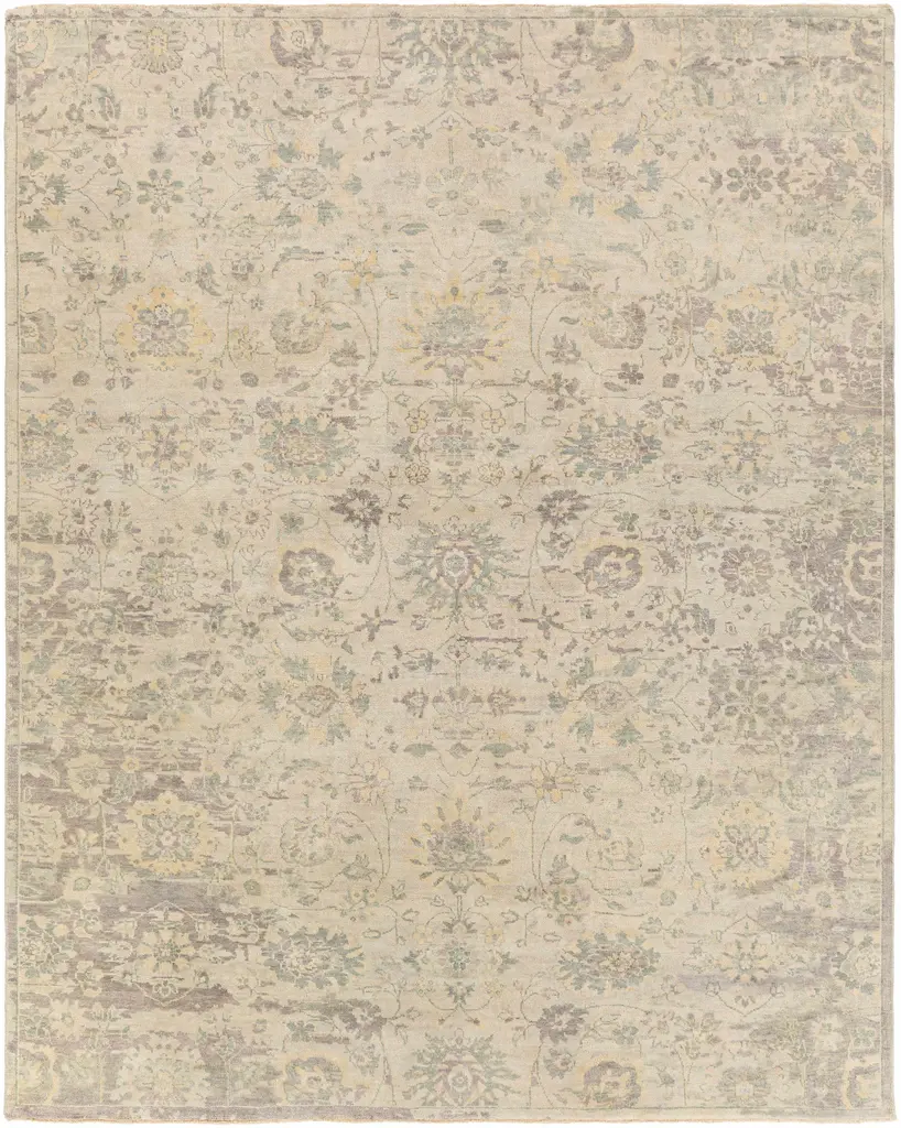 Collection: Maybee Colors: Teal, Lavender, Light Sage, Peach Construction: Hand Knotted Material: 100% Wool Pile: Medium Pile Pile Height: 0.23" Styles: Transitional Made In: India Thickness: 0.31" Fringe Length: 0.5" Price Range: $$$$$ (Premium)