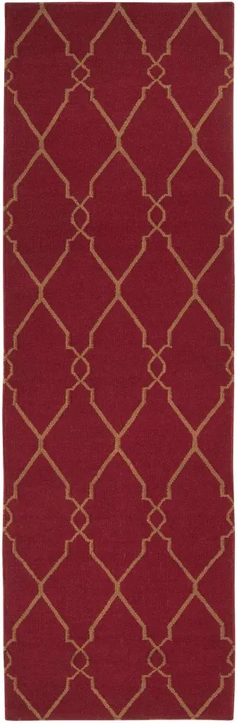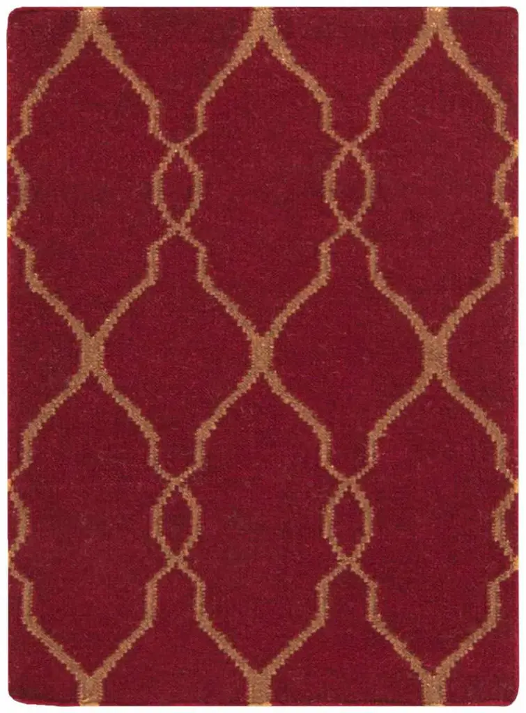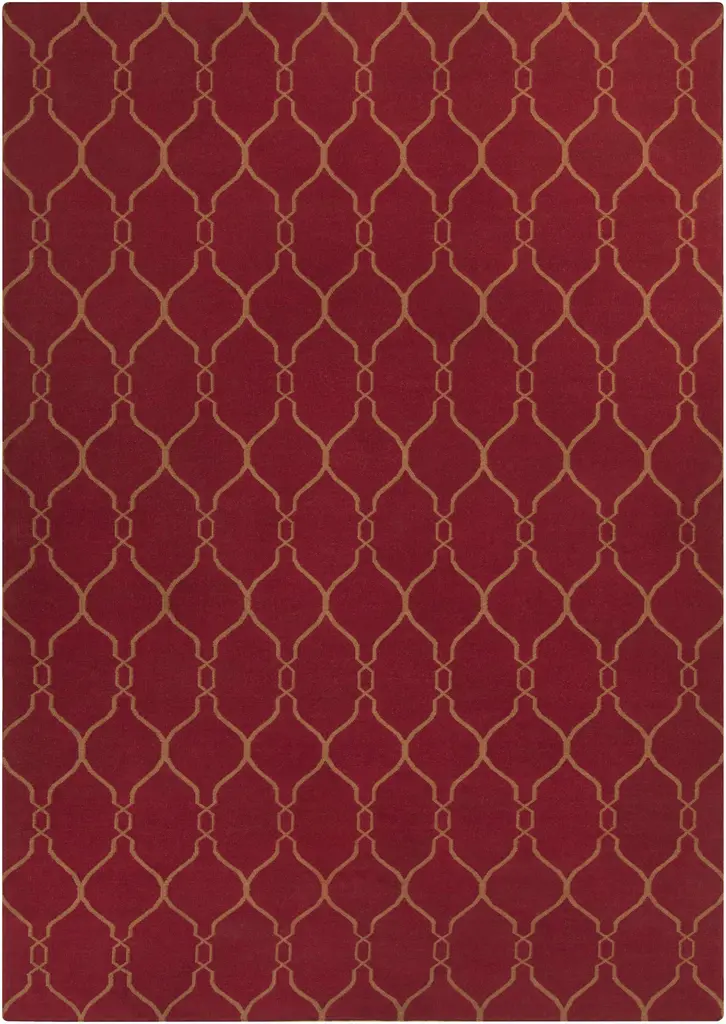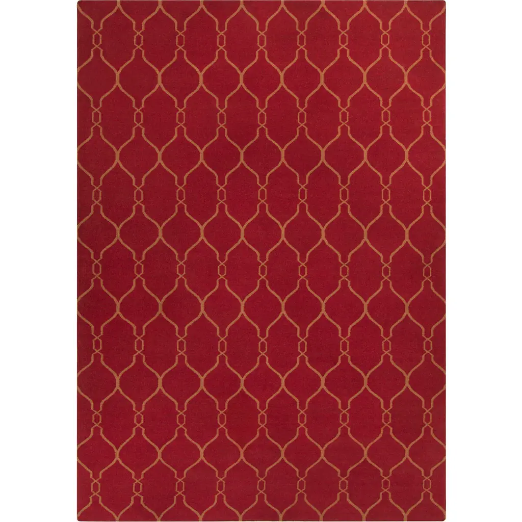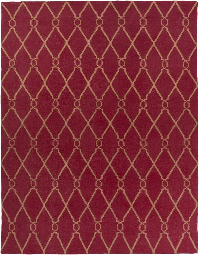 Collection: Mayville Colors: Rust, Dark Red Construction: Hand Woven Material: 100% Wool Pile: No Pile Styles: Transitional Made In: India Thickness: 0.16" Price Range: $$$$$ (Most Affordable)