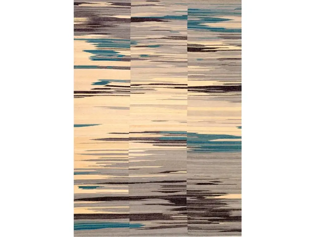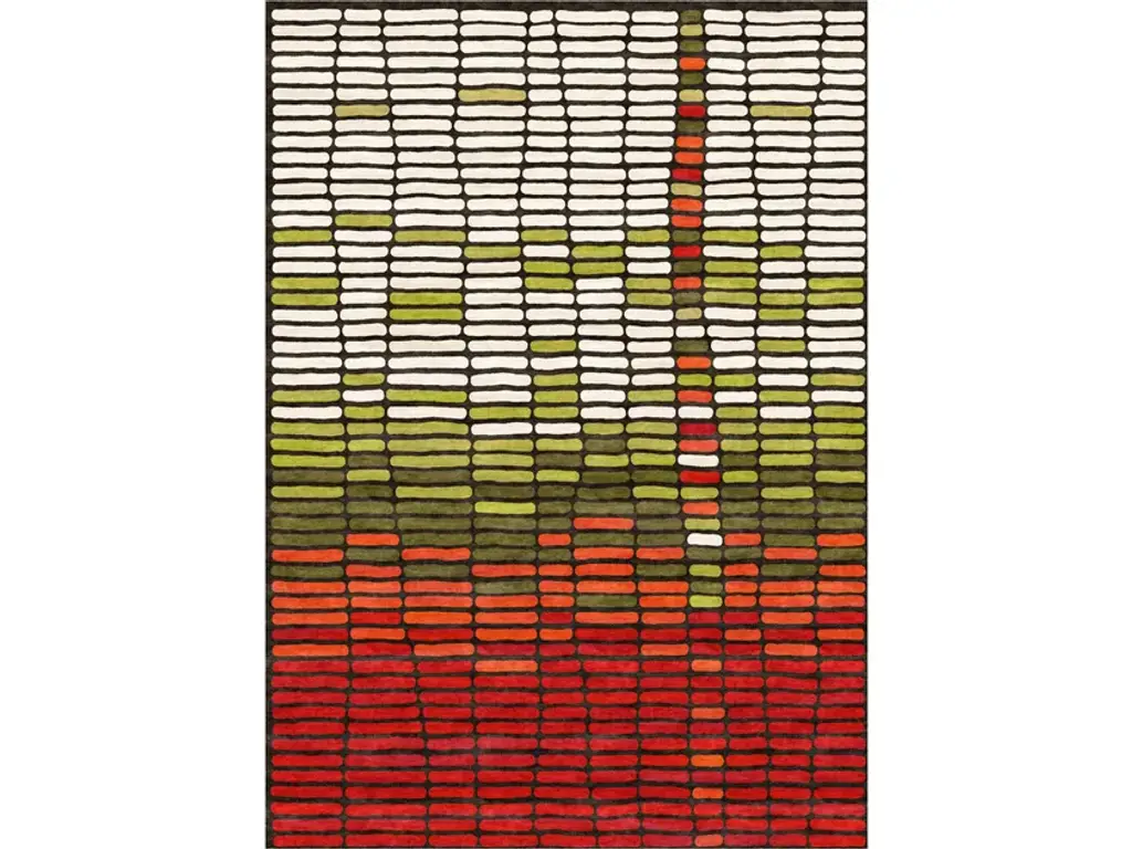 Mazandaran Kelim 7 is a rectangular wool rug.Zollanvari ‘minimalist’ kilims are diverse. Baneh kilims are woven in northern regions in sections using natural undyed wools and then skilfully stitched together. The one-piece Zagros kilims woven by the Luri and Ghashgha’i nomads are monochromatic. They have traditional ‘lazy lines’ that form subtle patterns of diamonds and squares. Maryam kilims, woven by the same tribes, have plain ground colours with repeat motifs hand-embroidered in pure silk, awarded Best Innovation at the CDAs in 2009. The jewel in the crown of our ‘minimalist’ flatweaves is a collection that draws inspiration from the old and antique Mazandaran kilims that have appeared on the market in the past decade – a truly modern collection. Caprino is a new flatweave collection woven from undyed goat’s hair on which pile-knotted erratic modernist lines in bright colours are superimposed.