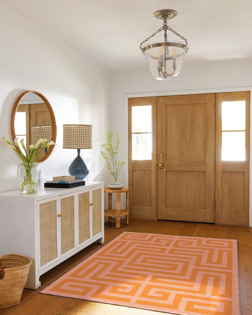 Get lost in our vibrant and contemporary Maze Pink & Orange Rug. Inspired by a fusion of modern outdoor pool architecture and traditional Greek key patterns, this geometric design brings bold and preppy summer colors to any floor. Feel like you're in an 80's video game surrounded by bright soft pink and rich tangerine tones. Water-resistant, stain-resistant, and machine-washable. Rug colors may vary slightly according to your device and the lighting in your space.