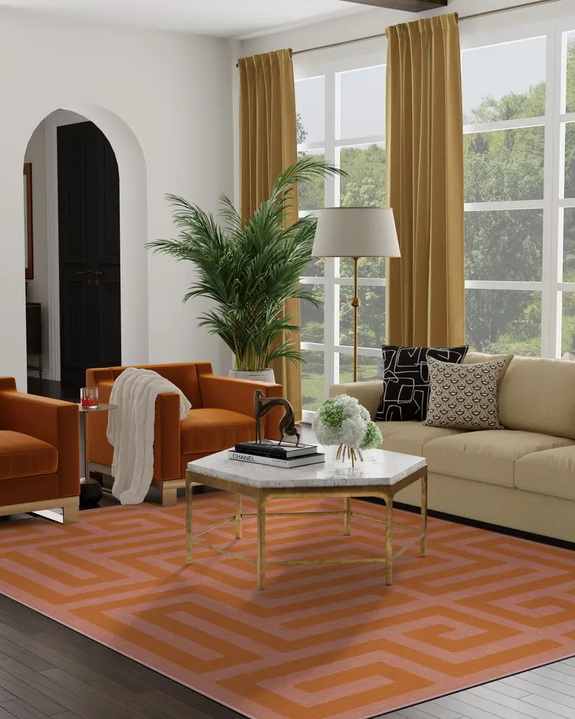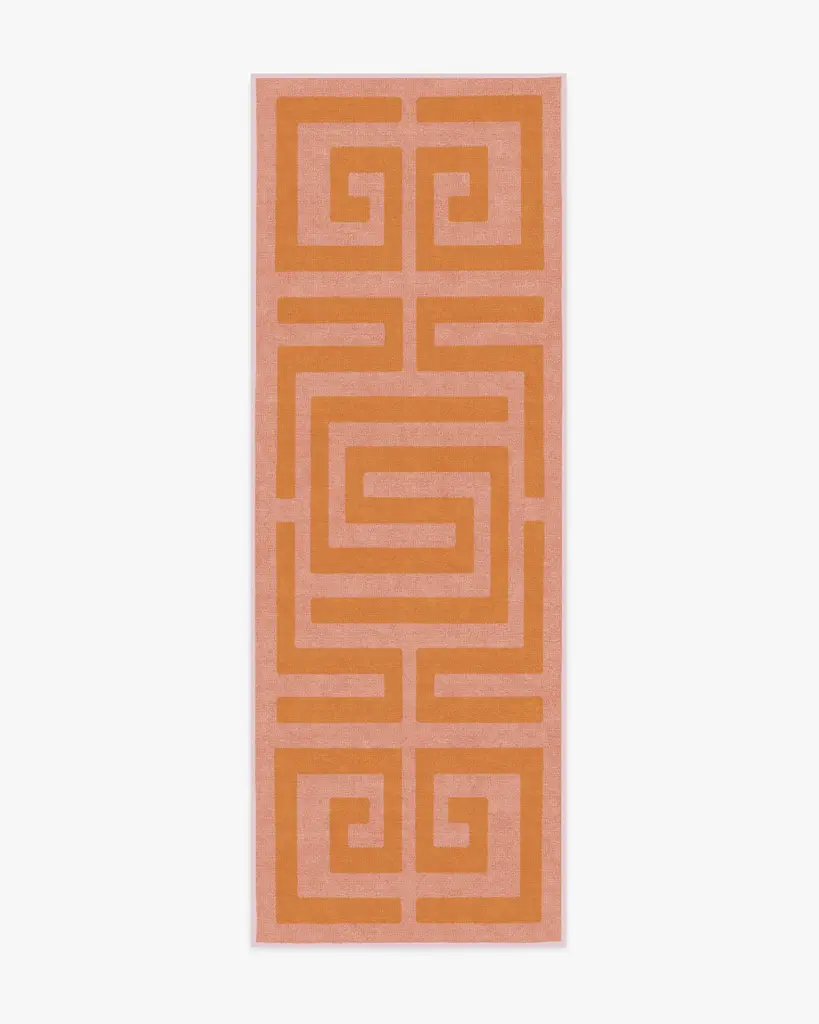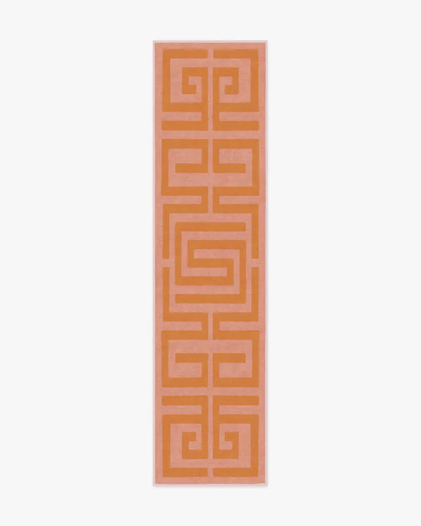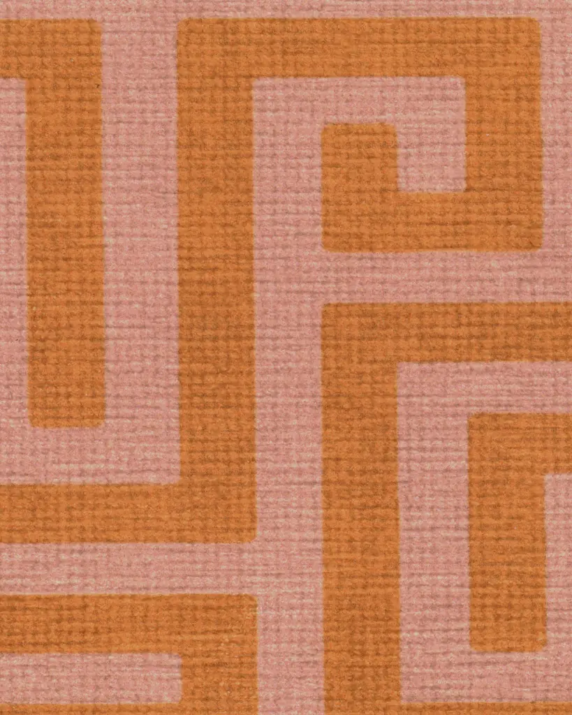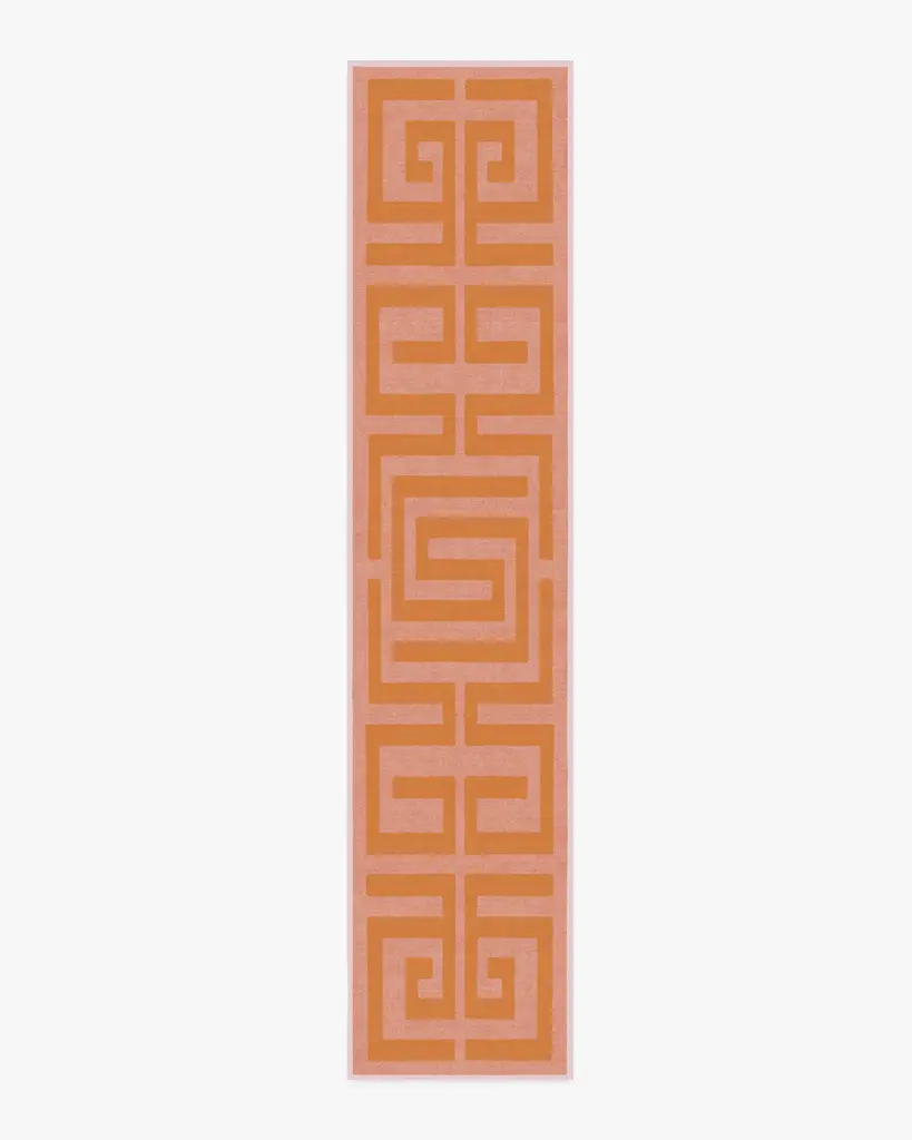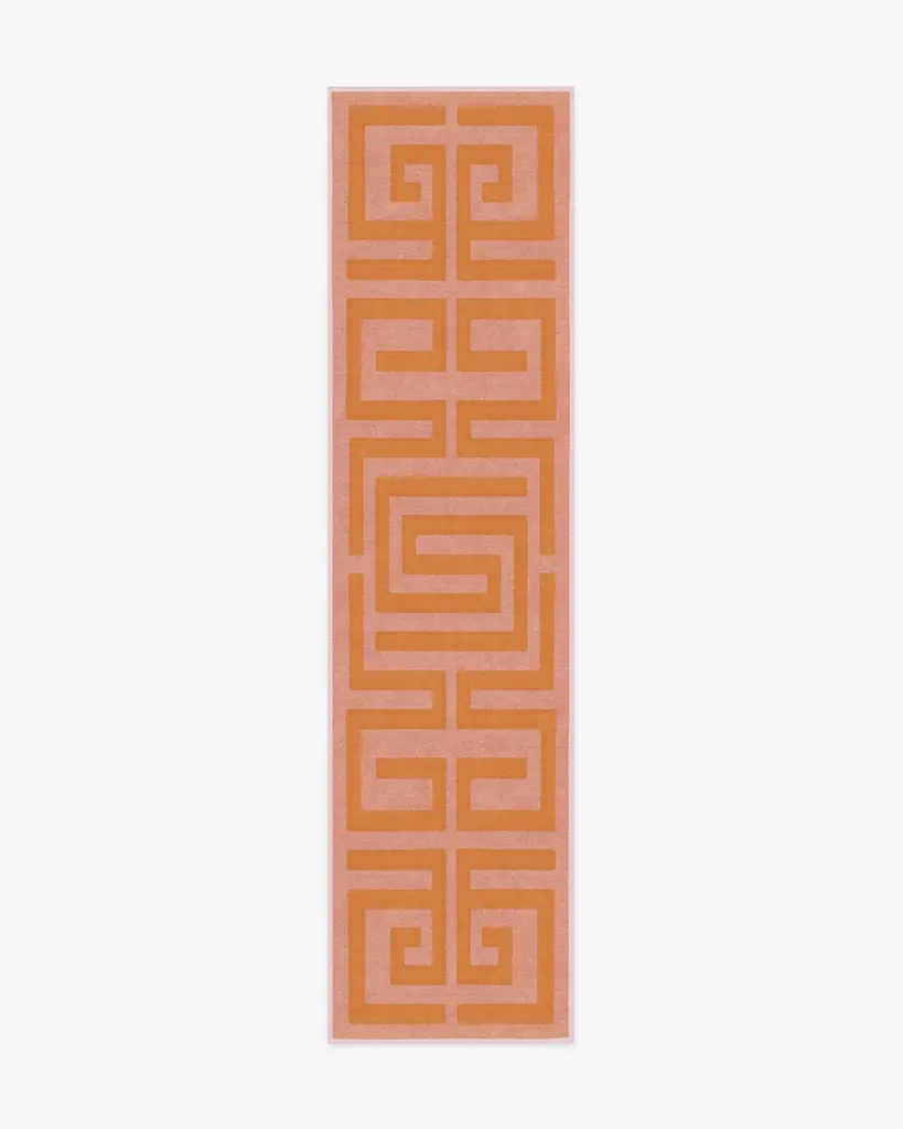 Get lost in our vibrant and contemporary Maze Pink & Orange Rug. Inspired by a fusion of modern outdoor pool architecture and traditional Greek key patterns, this geometric design brings bold and preppy summer colors to any floor. Feel like you're in an 80's video game surrounded by bright soft pink and rich tangerine tones. Water-resistant, stain-resistant, and machine-washable. Rug colors may vary slightly according to your device and the lighting in your space.