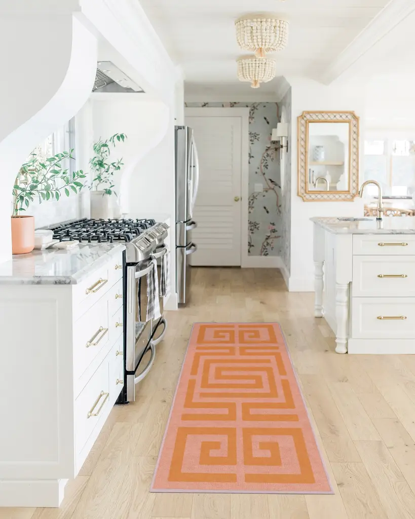 Get lost in our vibrant and contemporary Maze Pink & Orange Rug. Inspired by a fusion of modern outdoor pool architecture and traditional Greek key patterns, this geometric design brings bold and preppy summer colors to any floor. Feel like you're in an 80's video game surrounded by bright soft pink and rich tangerine tones. Water-resistant, stain-resistant, and machine-washable. Rug colors may vary slightly according to your device and the lighting in your space.