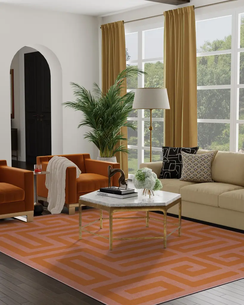 Get lost in our vibrant and contemporary Maze Pink & Orange Rug. Inspired by a fusion of modern outdoor pool architecture and traditional Greek key patterns, this geometric design brings bold and preppy summer colors to any floor. Feel like you're in an 80's video game surrounded by bright soft pink and rich tangerine tones. Water-resistant, stain-resistant, and machine-washable. Rug colors may vary slightly according to your device and the lighting in your space.