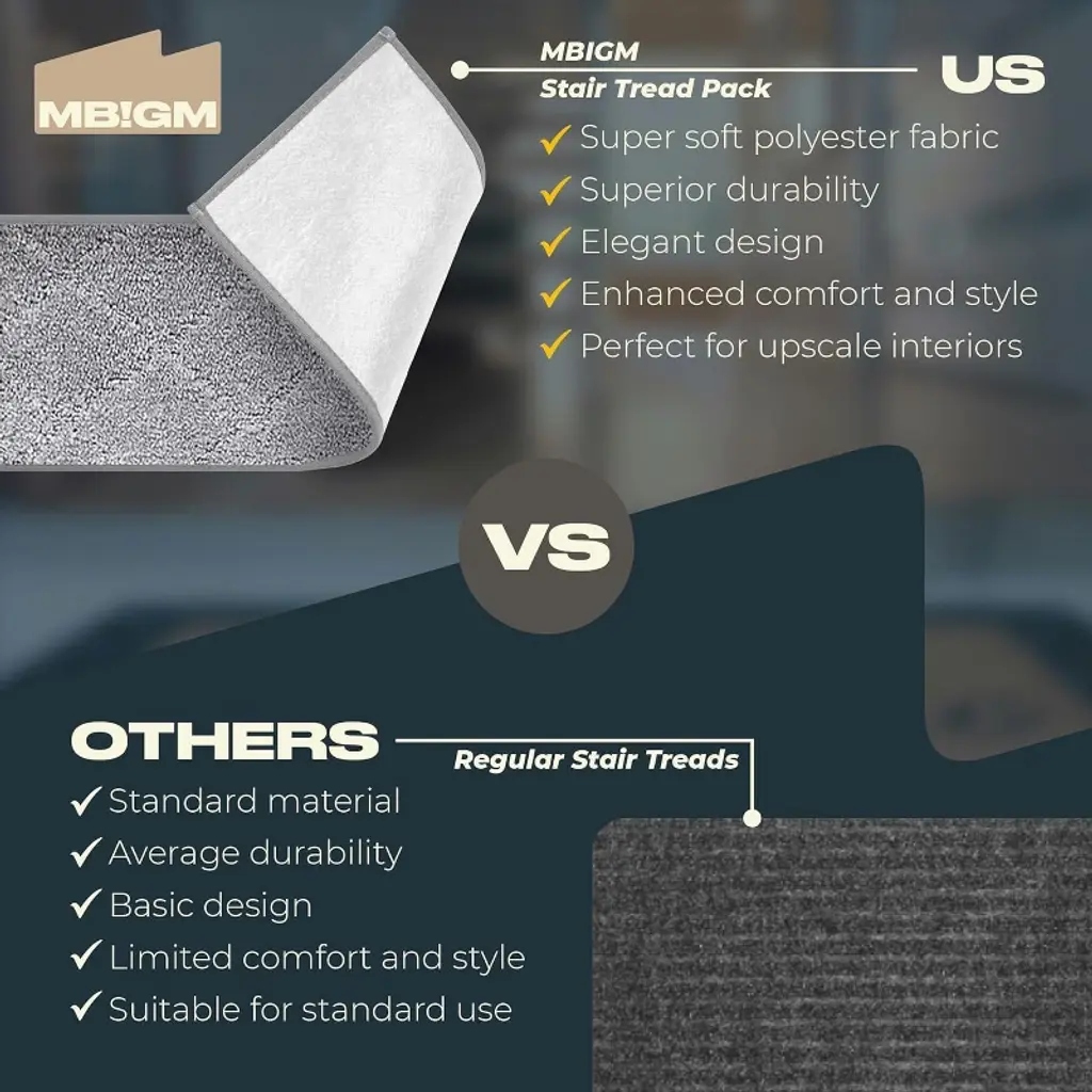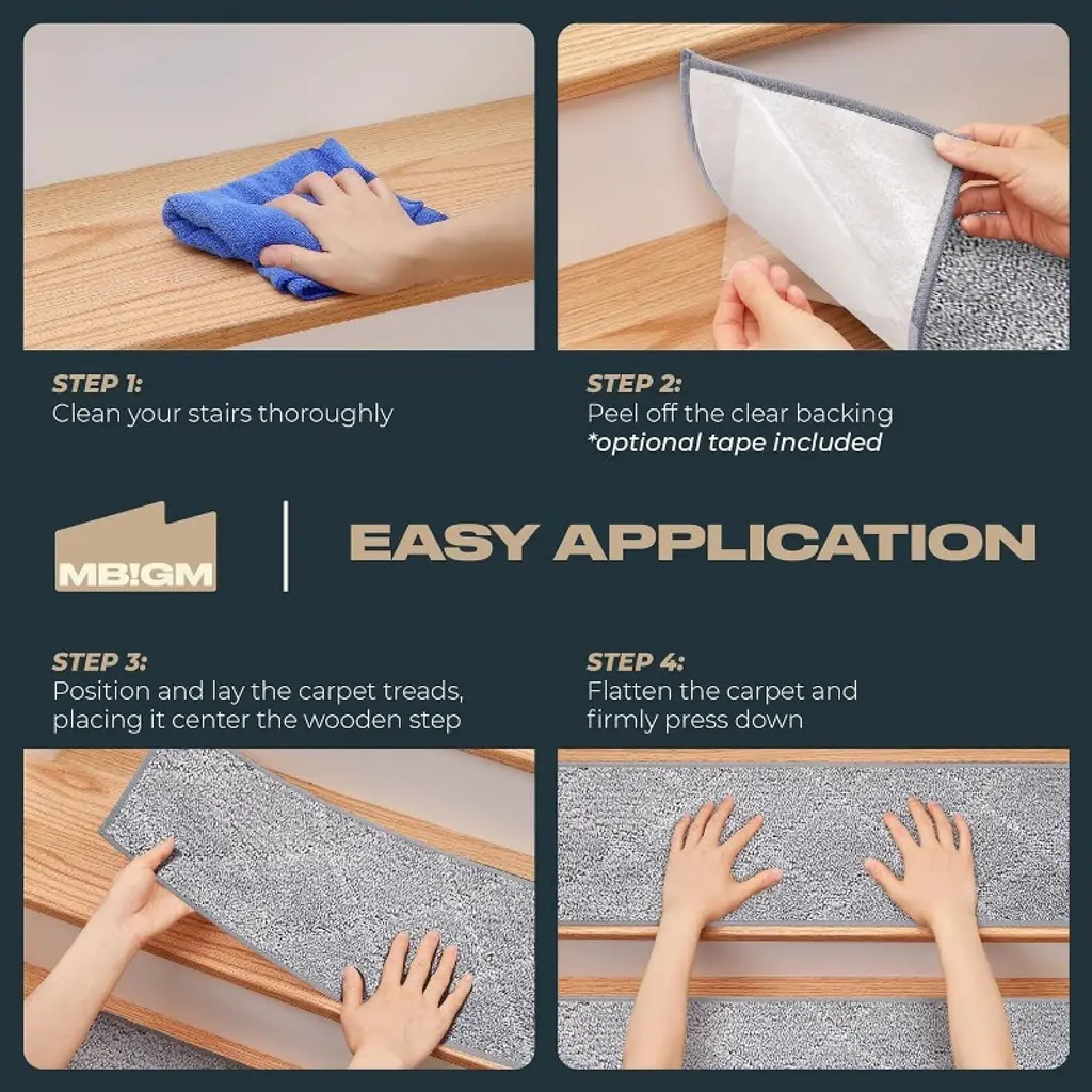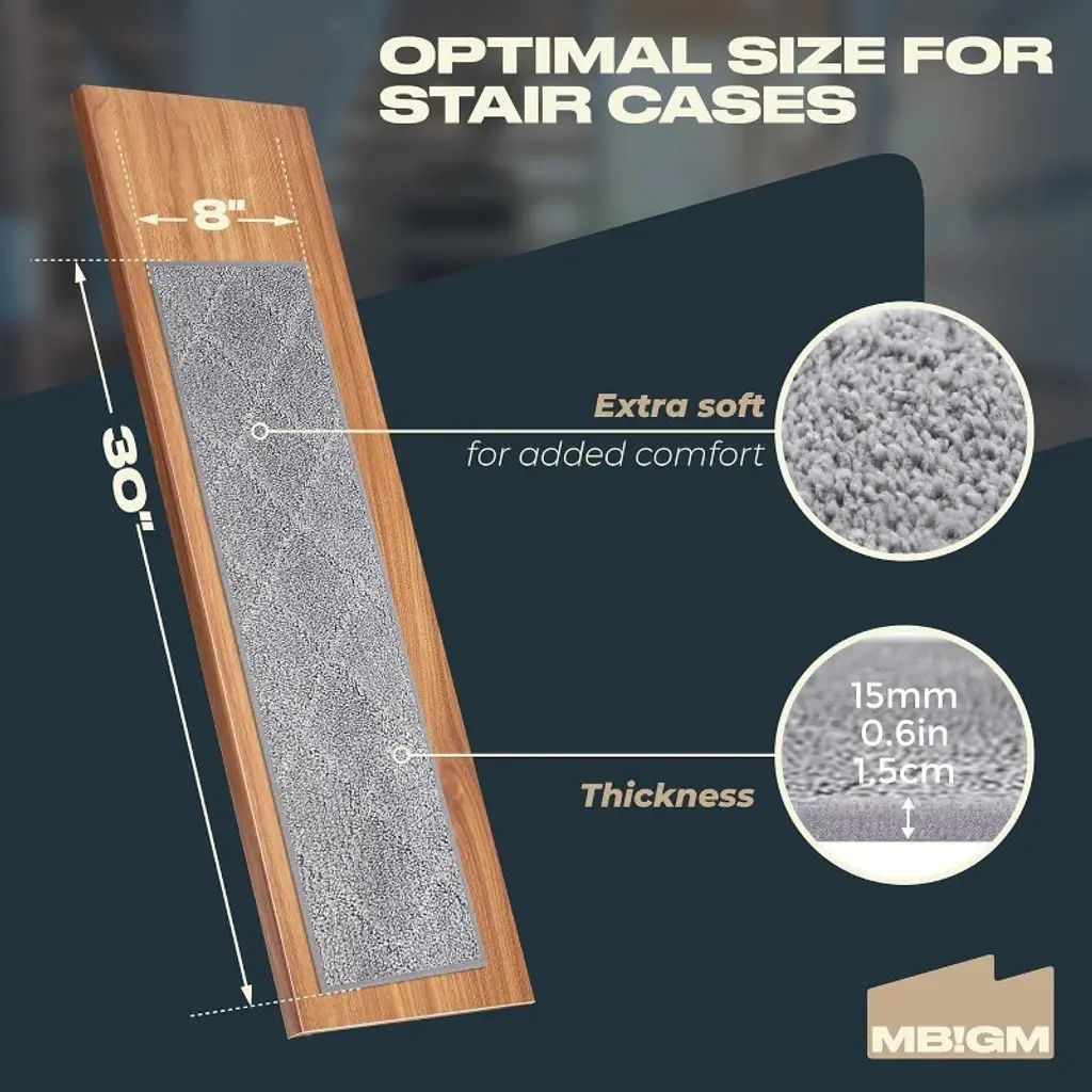 Enhance the safety and elegance of your home with the MBIGM Carpet Stair Treads for Wooden Steps. These treads combine top-notch safety features with luxurious comfort, seamlessly fitting into any home decor. Ideal for families with kids, elders, and pets, these treads prevent slips and falls with a robust non-slip TPE backing, ensuring everyone can navigate your stairs with confidence. Enhanced Safety: The non-slip TPE backing provides exceptional grip on wooden stairs, significantly reducing the risk of slips and offering peace of mind in your home.Effortless Installation: Featuring an adhesive that allows easy application and adjustment without damaging your steps, these treads simplify setup and maintenance—no professional help needed.Comfort and Style: Each tread is crafted with soft, plush fabric that not only feels great underfoot but also damps noise, making your steps both quieter and more comfortable. Commit to a safer, more stylish living environment with the MBIGM Carpet Stair Treads. Order yours today to secure and beautify your wooden stairs, ensuring a safer, more enjoyable home for your family, pets, and guests. Don't let this essential addition to your home slip by—upgrade your stairs with these modern, efficient treads now!