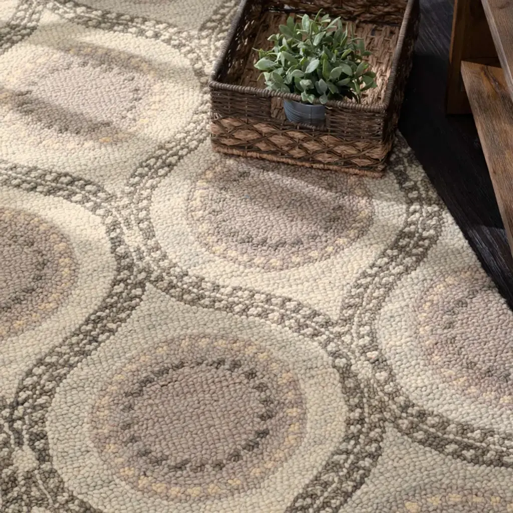 Unroll instant warmth and beauty underfoot with this eye-catching large-scale medallion area rug, crafted from naturally soft and durable wool. Specially hand-hooked for smooth, luxurious comfort and long-lasting texture that will give you years of use. The micro loops that create the design add depth and dimension, hiding all manner of spills and cleaning up quickly.