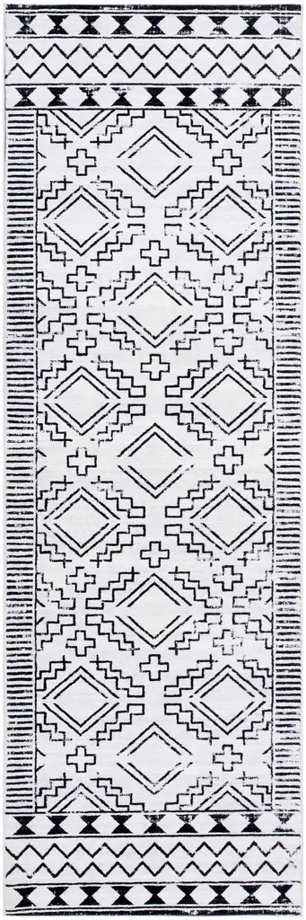 Collection: Medan Colors: Off White, Gray, Black Construction: Machine Woven Material: 100% Polyester Pile: Low Pile Pile Height: 0.12" Styles: Transitional,Bohemian Backing: Canvas Machine Washable: Yes Made In: China Thickness: 0.25" Price Range: $$$$$ (Most Affordable)